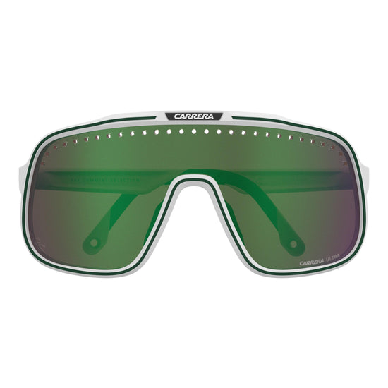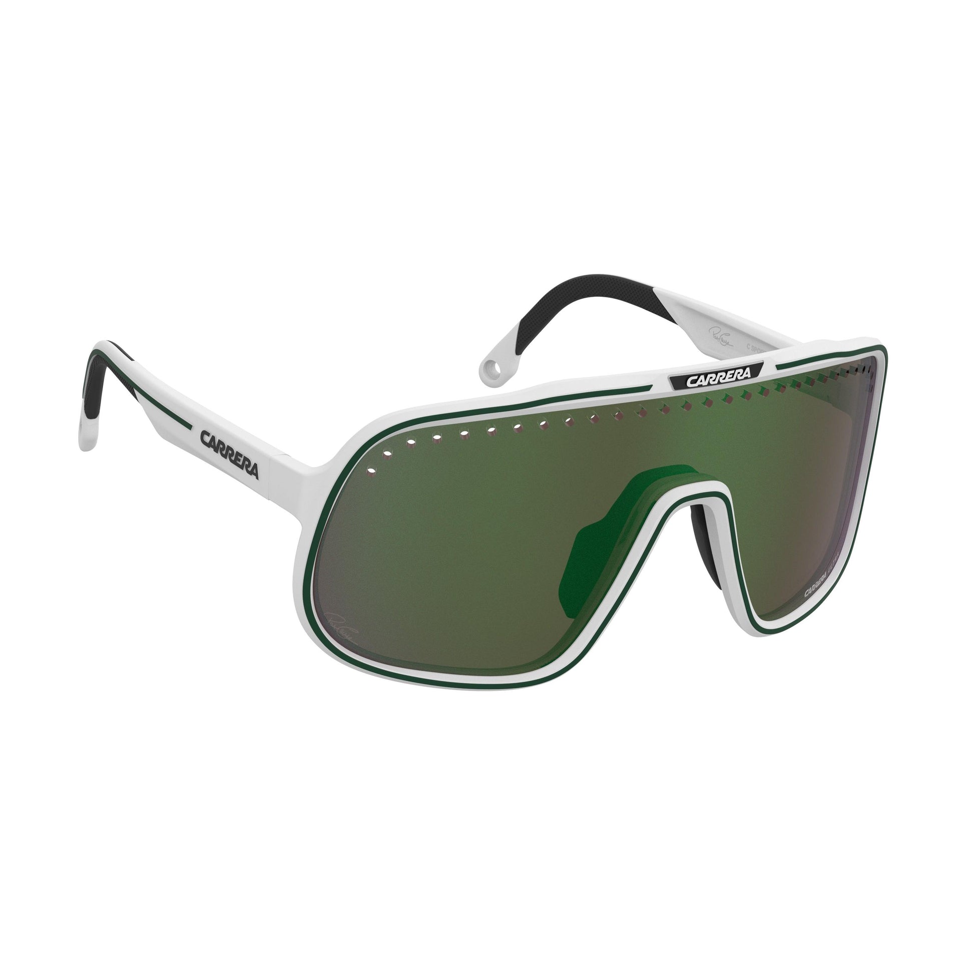 Inspired by sport and designed to be worn everywhere, these sunglasses express the bold style of Carrera. This high-performance style features a wraparound design with patented high contrast Carrera Ultra lenes and lightweight injected construction. Worn by Pat Cummins on-field, this model embodies Carrera’s synergy of technical innovation and elite sport. The lens is available in green/brown high definition or mauve/blue high-definition options, both with 100% UV Protection. Impeccable with sporty outfits and unforgettable as part of street-style ensembles, these sunglasses feature the iconic Pat Cummins green temples and gold signature and are designed to be worn with ease. The front is compatible with prescription clip-in lenses which can be purchased separately.