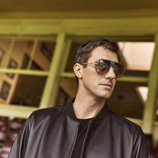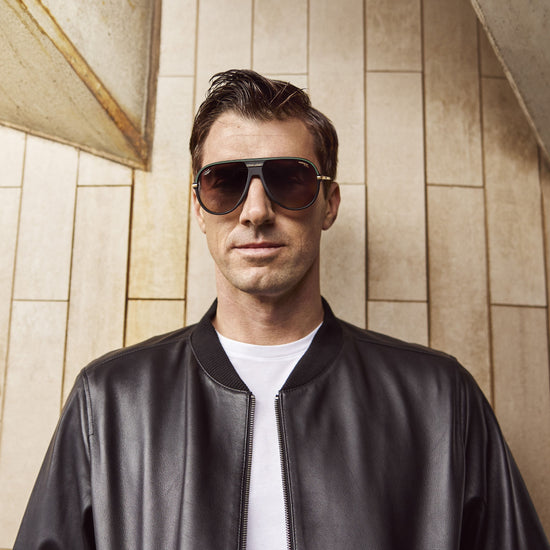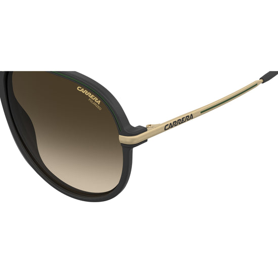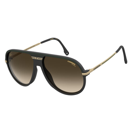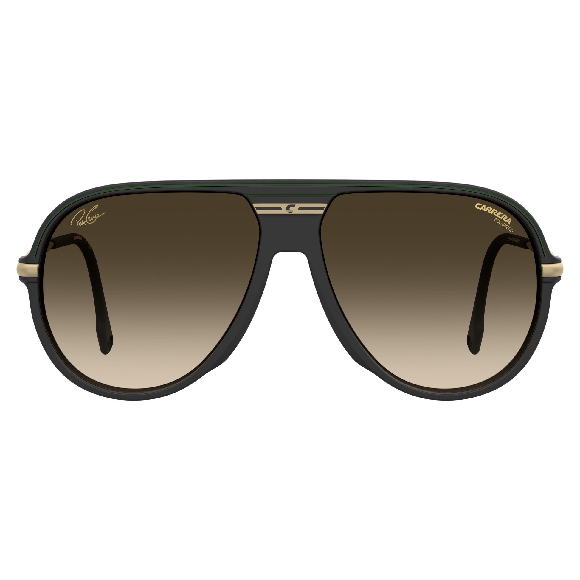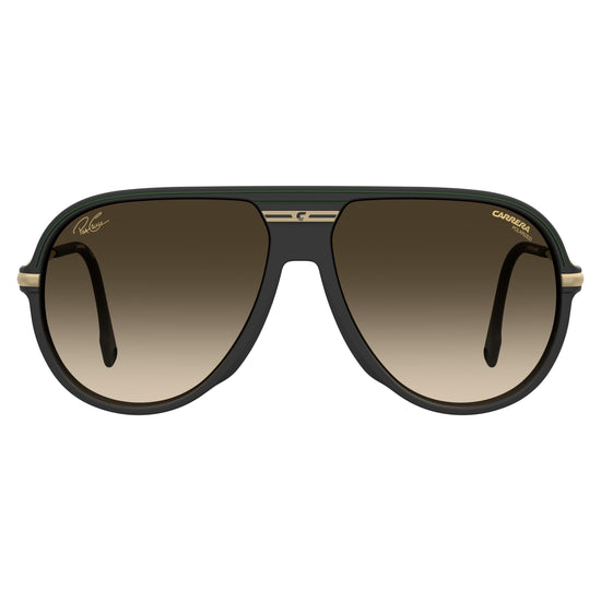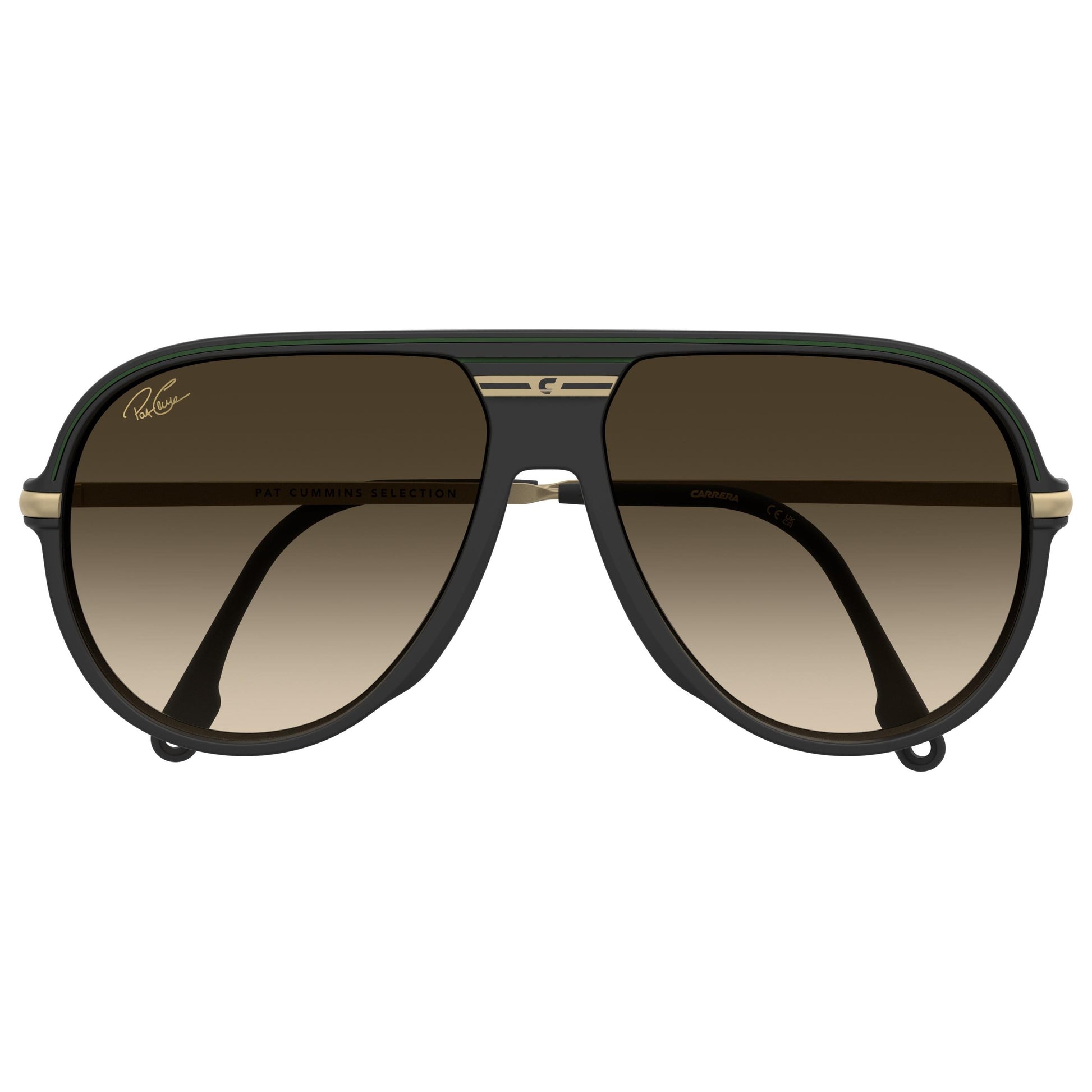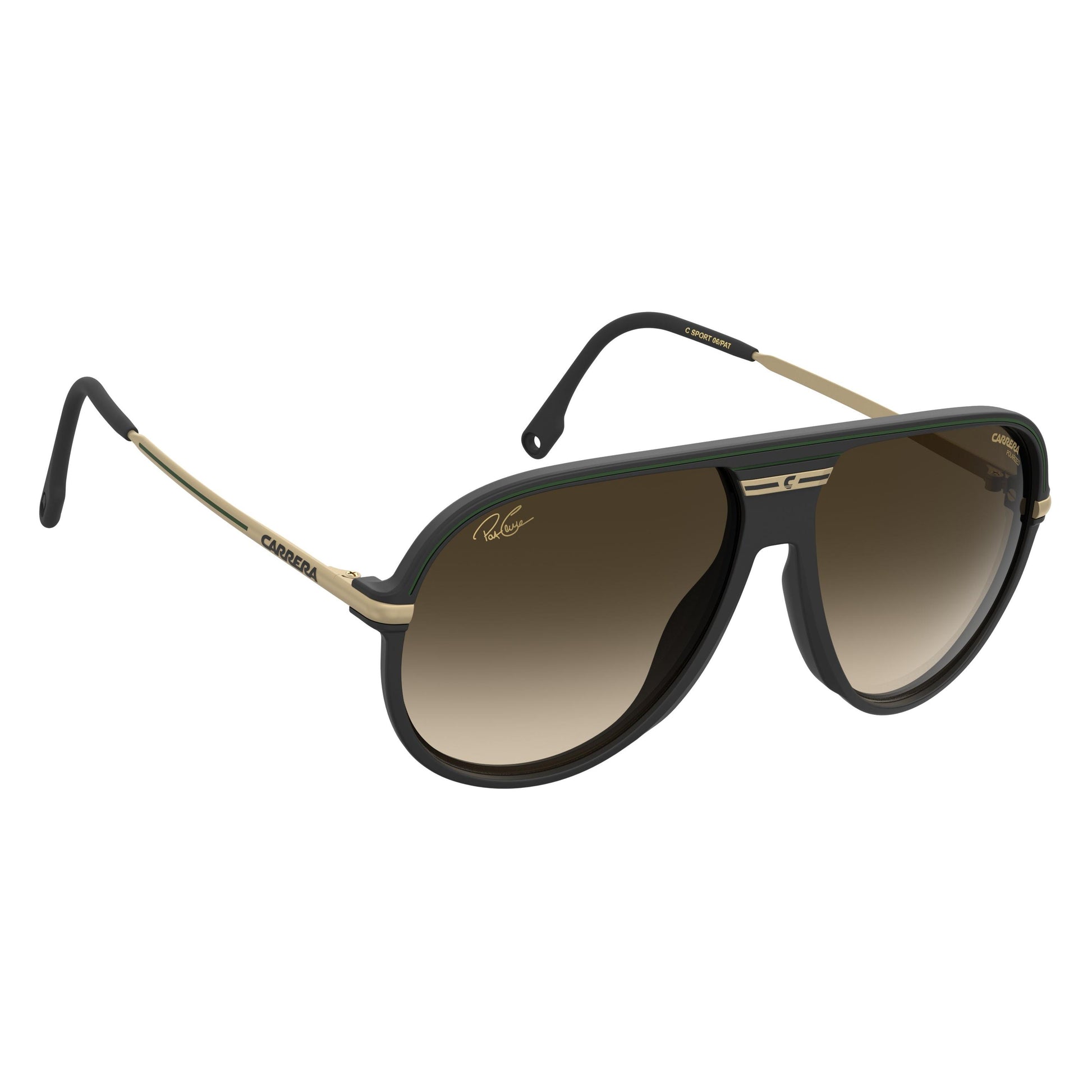 Directly from the archives, but with a contemporary twist: these sunglasses celebrate Carrera heritage and Pat’s style. The iconic ‘C’ dominates the aviator front, with the logo tinted in signature green. The temples are in metal, with length-adjustable end tips designed for a close, stable fit and include the green hgihlight. The eyes are protected a brown gradient polarised lens proudly carrying Pat’s gold signature.