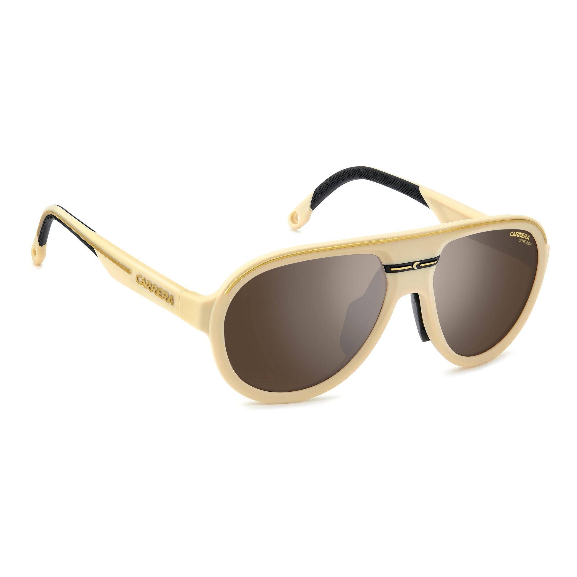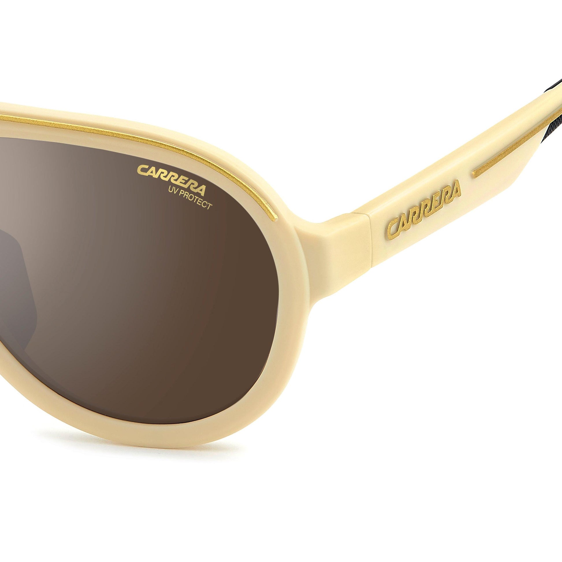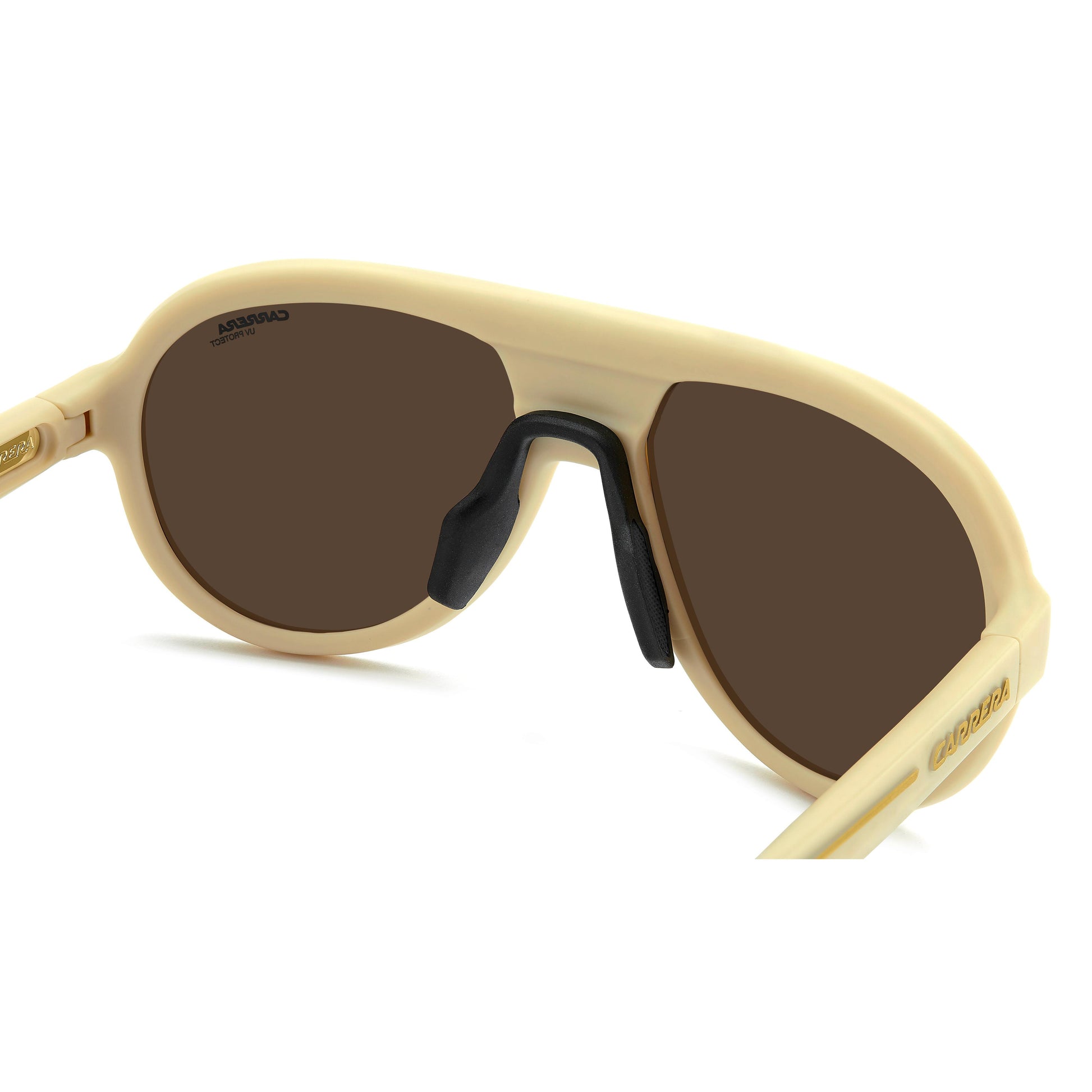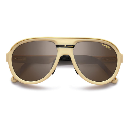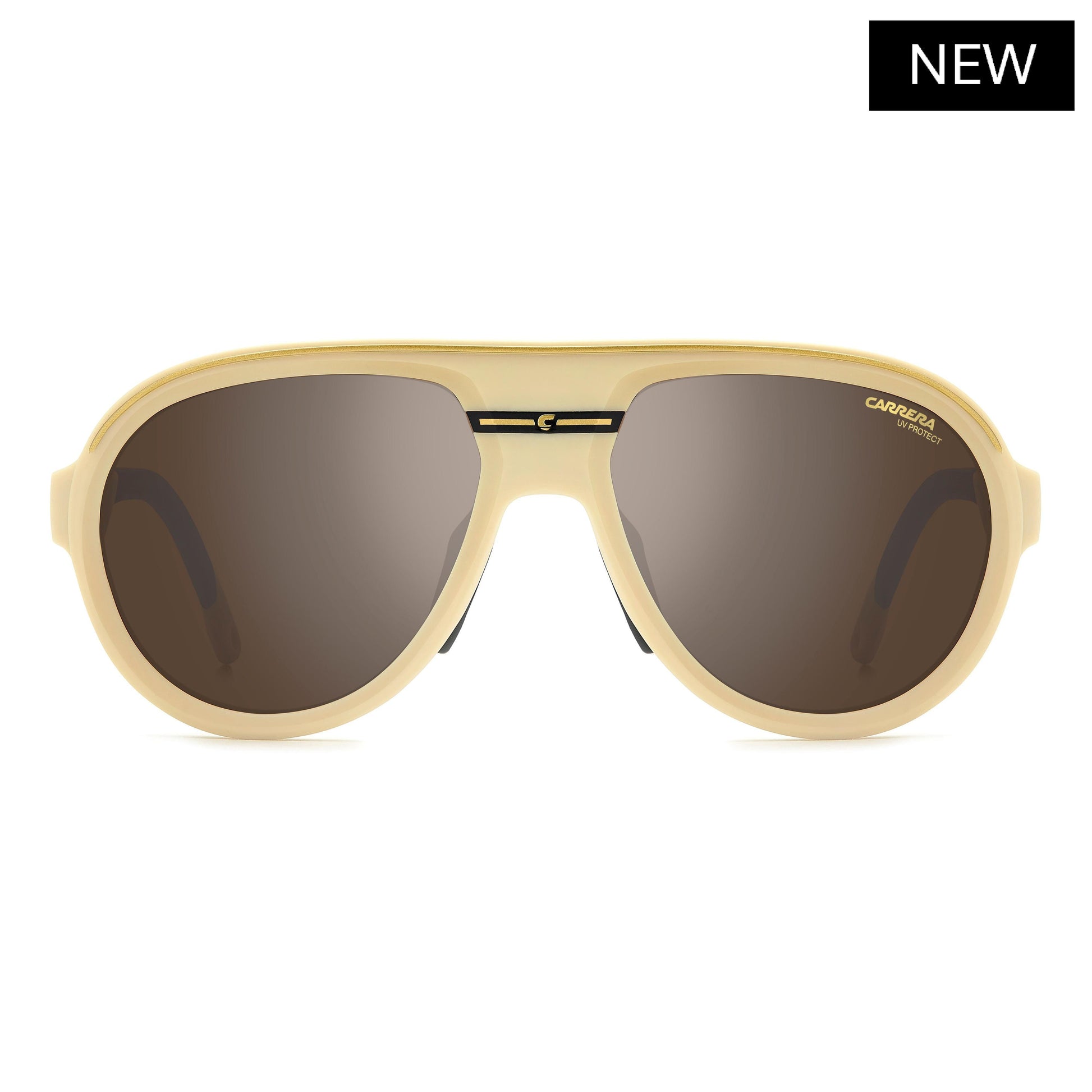 These Carrera sunglasses revisit an emblematic design from the brand's sporty heritage, echoing looks from the 1980s, when Carrera set fashion trends on the world's most exclusive slopes. The plastic aviator front features the Victory C logo placed horizontally and lateral magnets for optional spoilers. Rubber inserts on the temples ensure comfort while adjustable end tips with holes can be paired with an optional elastic band.