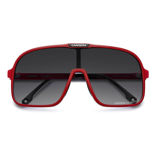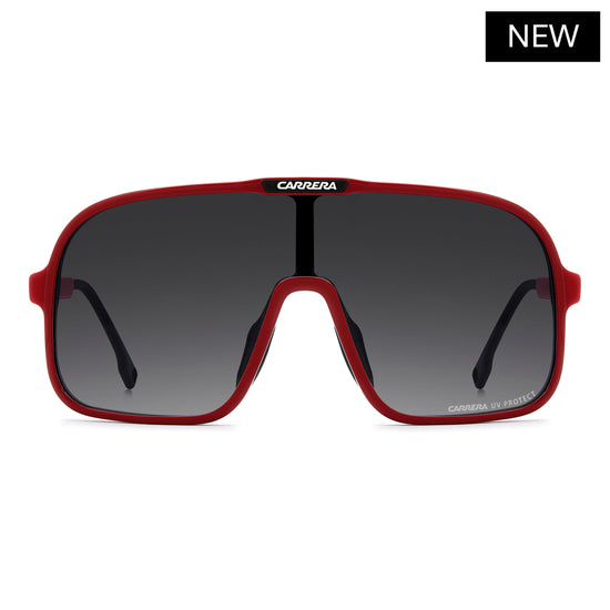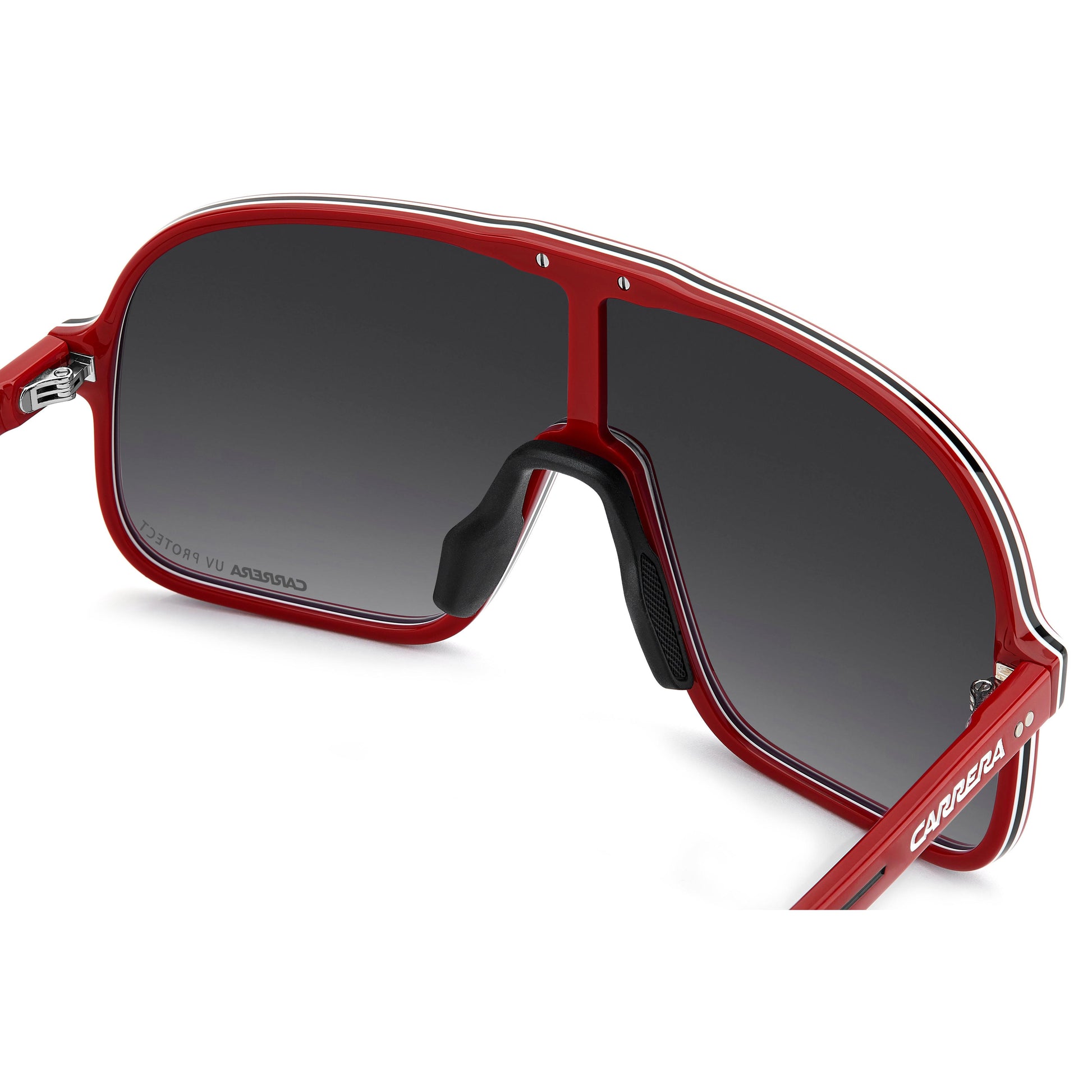 These sunglasses bring a fresh twist to Carrera's archival designs. The maxi-lens navigator front in acetate showcases sporty heritage, made even more iconic with multi-layer detailing. Rubber nose pads and adjustable curved end tips ensure a secure fit. The color palette includes a version with blue gradient lenses that's distinctively Carrera.