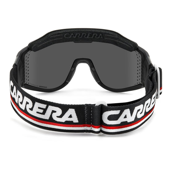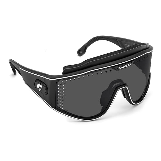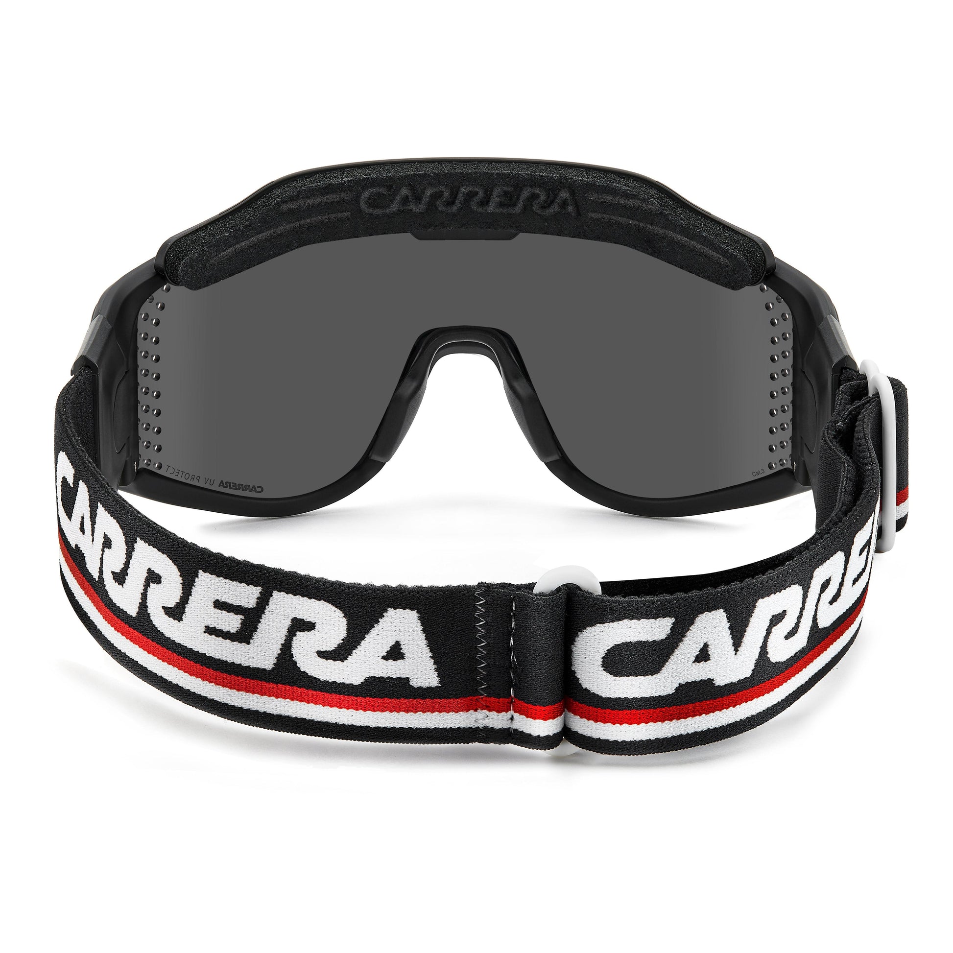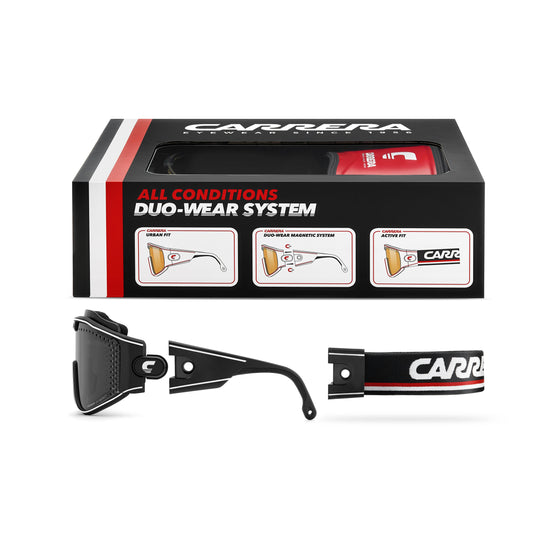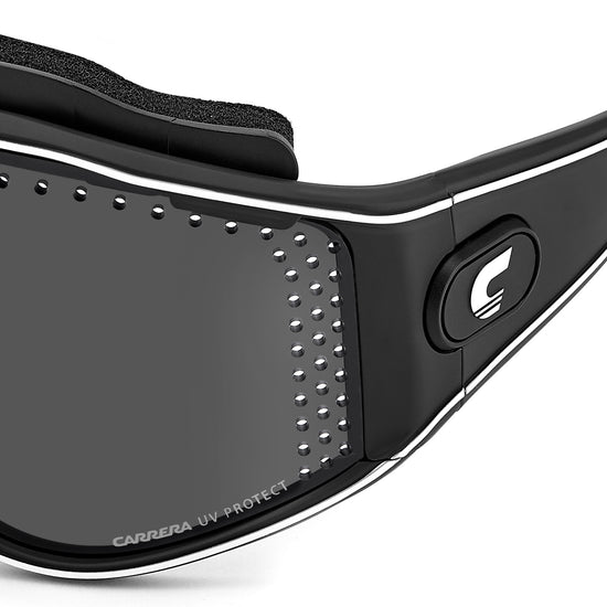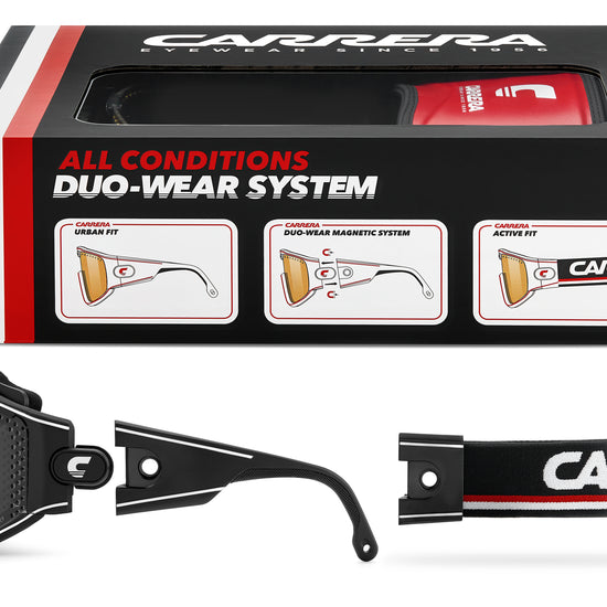 These special-edition Carrera sunglasses feature a shield front with air holes, celebrating the brand's sporty heritage. An innovative magnetic system lets you remove the temples and replace them with a branded elastic band, transforming this iconic style into snow goggles. Two lenses with different technologies can be easily interchanged thanks to Carrera's patented Boombox system, all included in the complete pack.