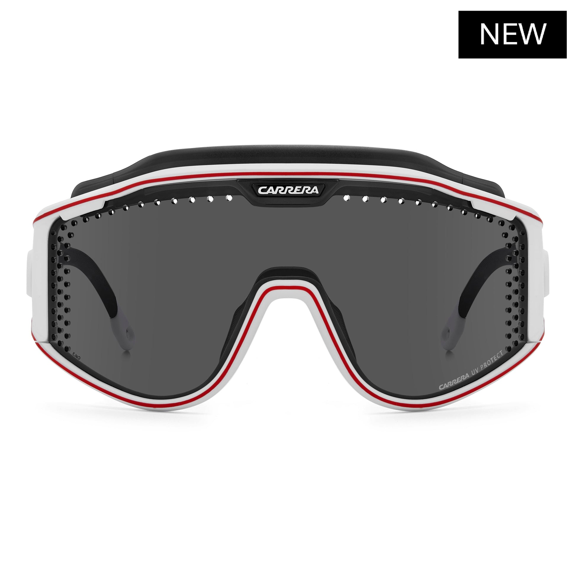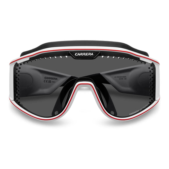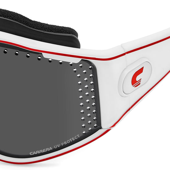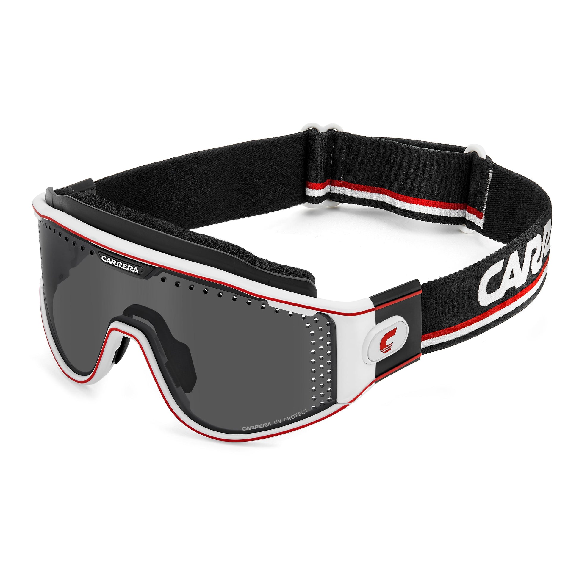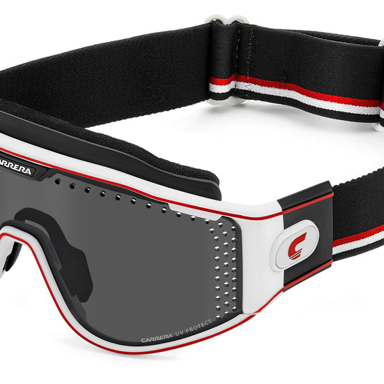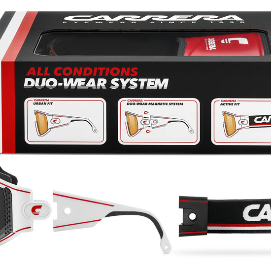 These special-edition Carrera sunglasses feature a shield front with air holes, celebrating the brand's sporty heritage. An innovative magnetic system lets you remove the temples and replace them with a branded elastic band, transforming this iconic style into snow goggles. Two lenses with different technologies can be easily interchanged thanks to Carrera's patented Boombox system, all included in the complete pack.