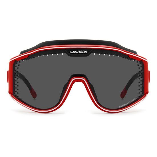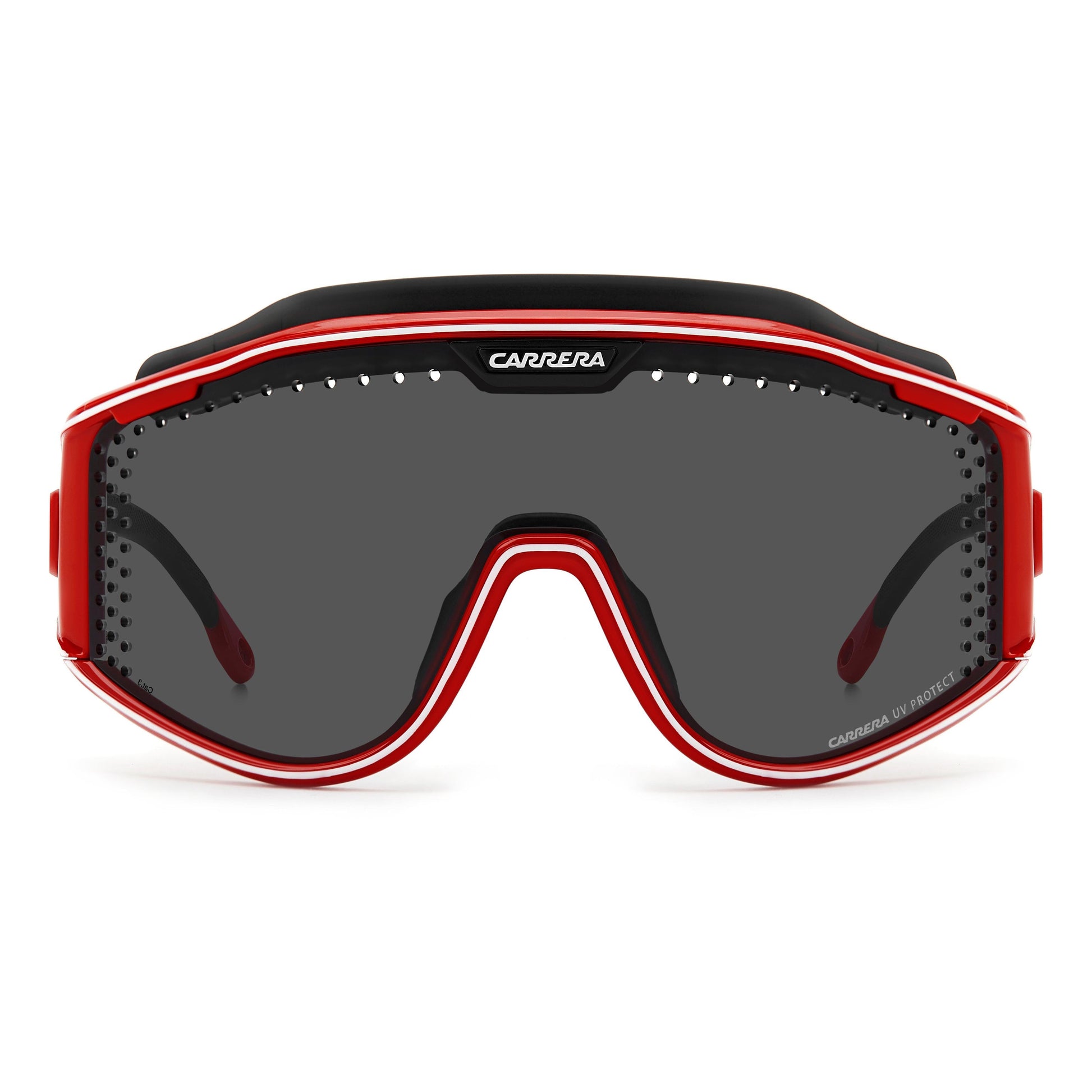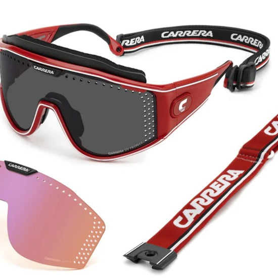 These special-edition Carrera sunglasses feature a shield front with air holes, celebrating the brand's sporty heritage. An innovative magnetic system lets you remove the temples and replace them with a branded elastic band, transforming this iconic style into snow goggles. Two lenses with different technologies can be easily interchanged thanks to Carrera's patented Boombox system, all included in the complete pack.