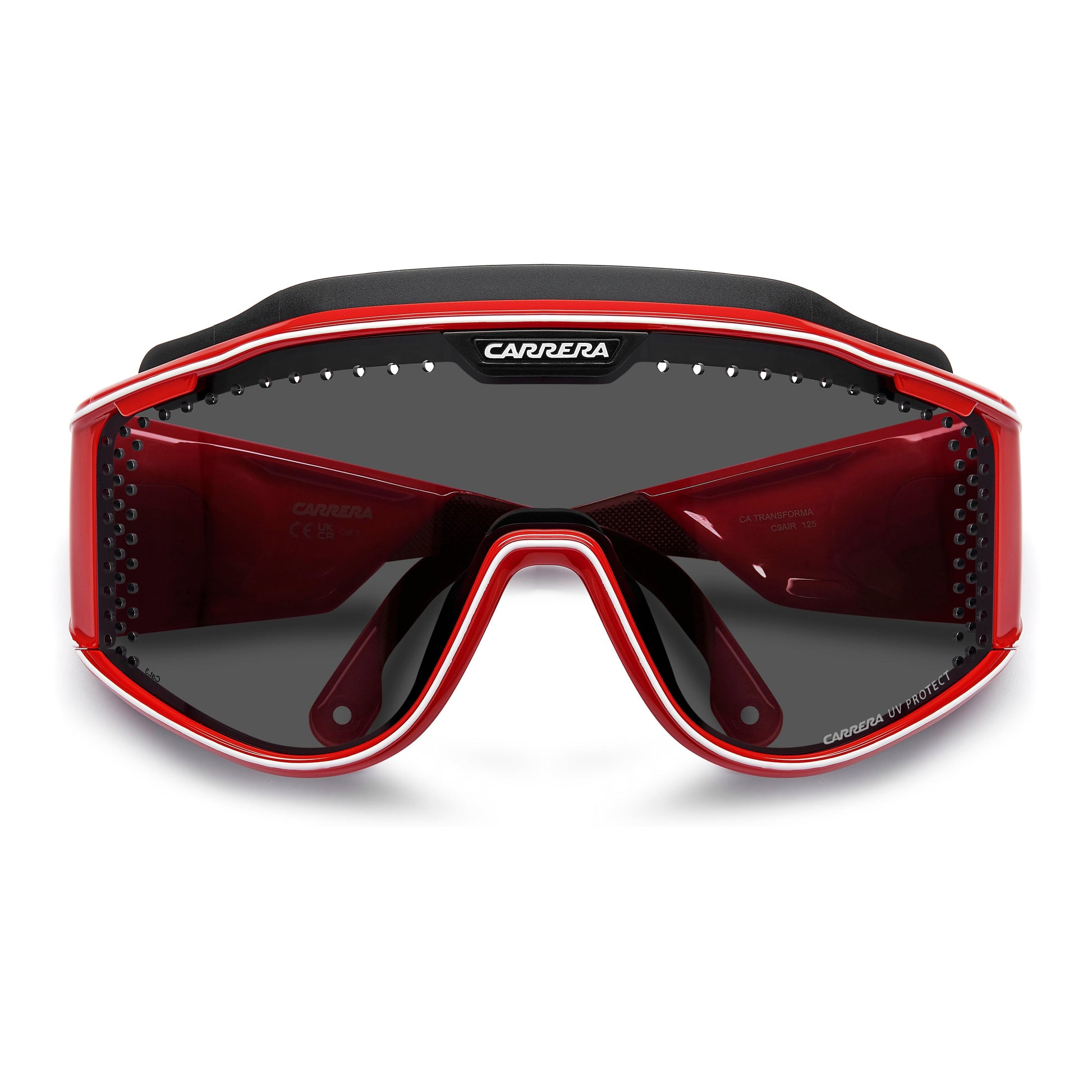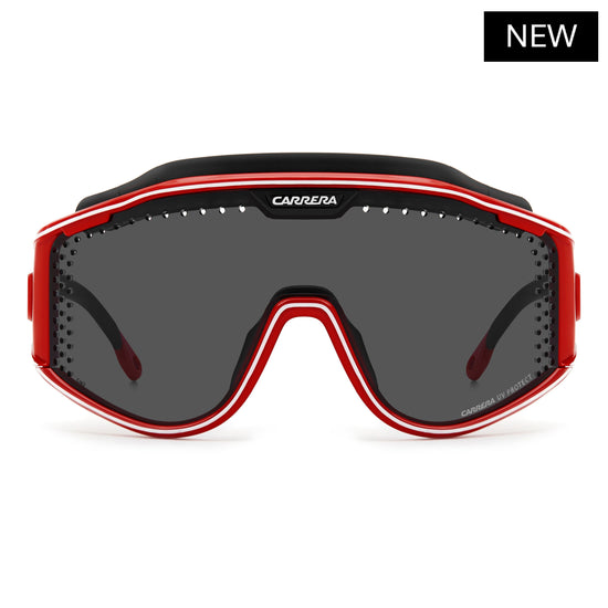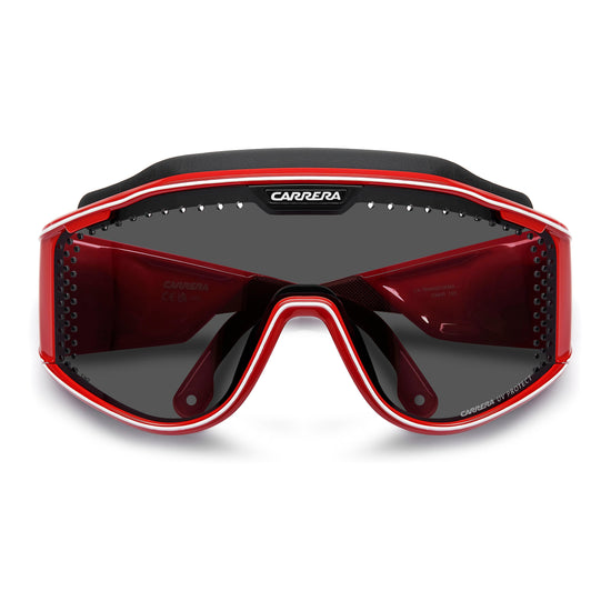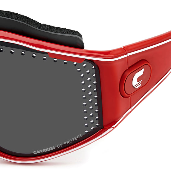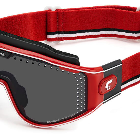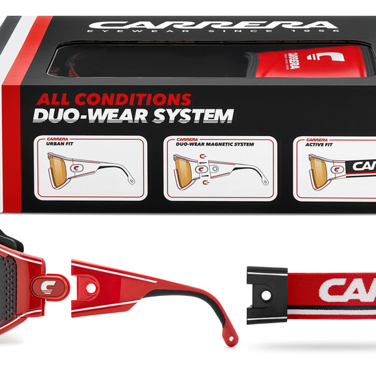 These special-edition Carrera sunglasses feature a shield front with air holes, celebrating the brand's sporty heritage. An innovative magnetic system lets you remove the temples and replace them with a branded elastic band, transforming this iconic style into snow goggles. Two lenses with different technologies can be easily interchanged thanks to Carrera's patented Boombox system, all included in the complete pack.