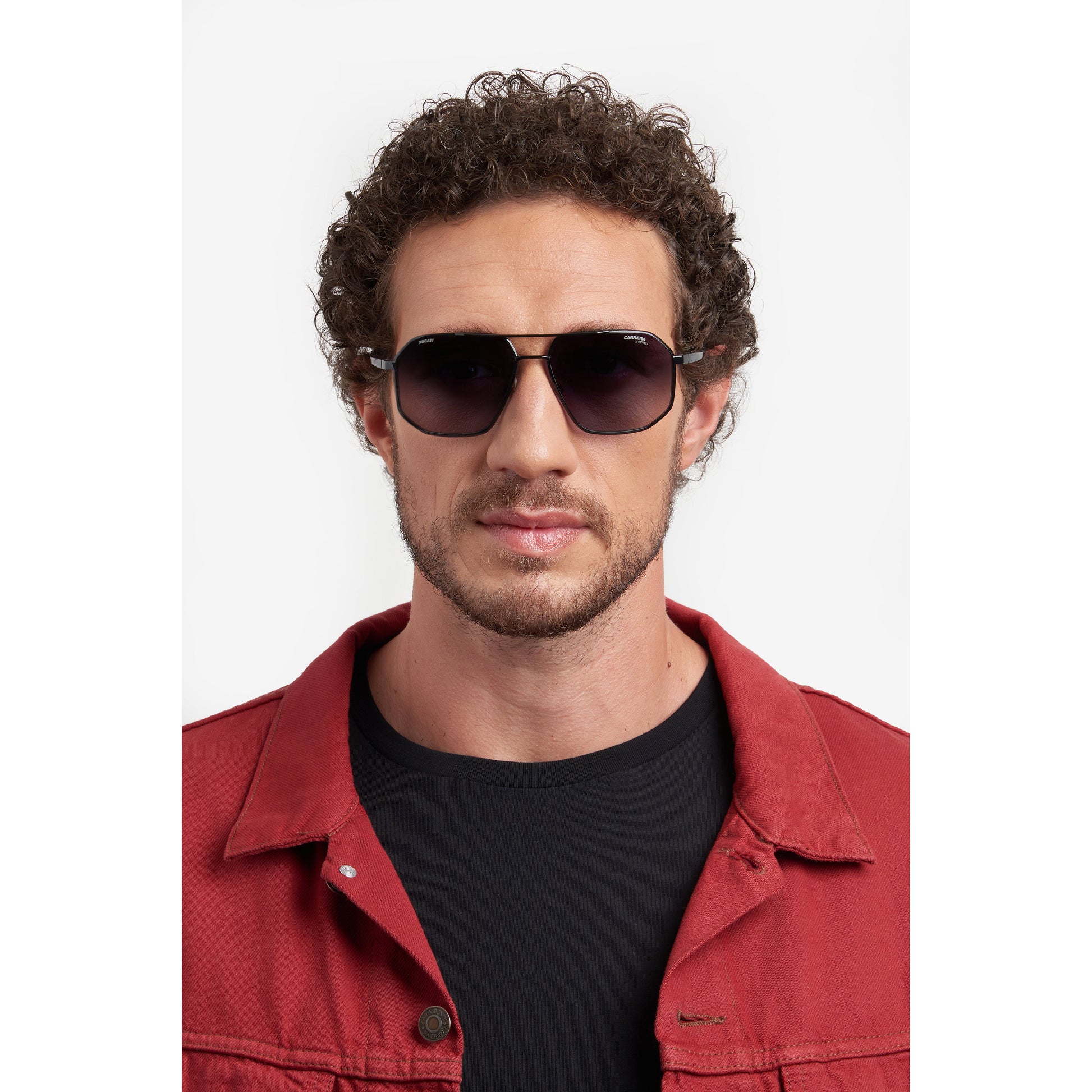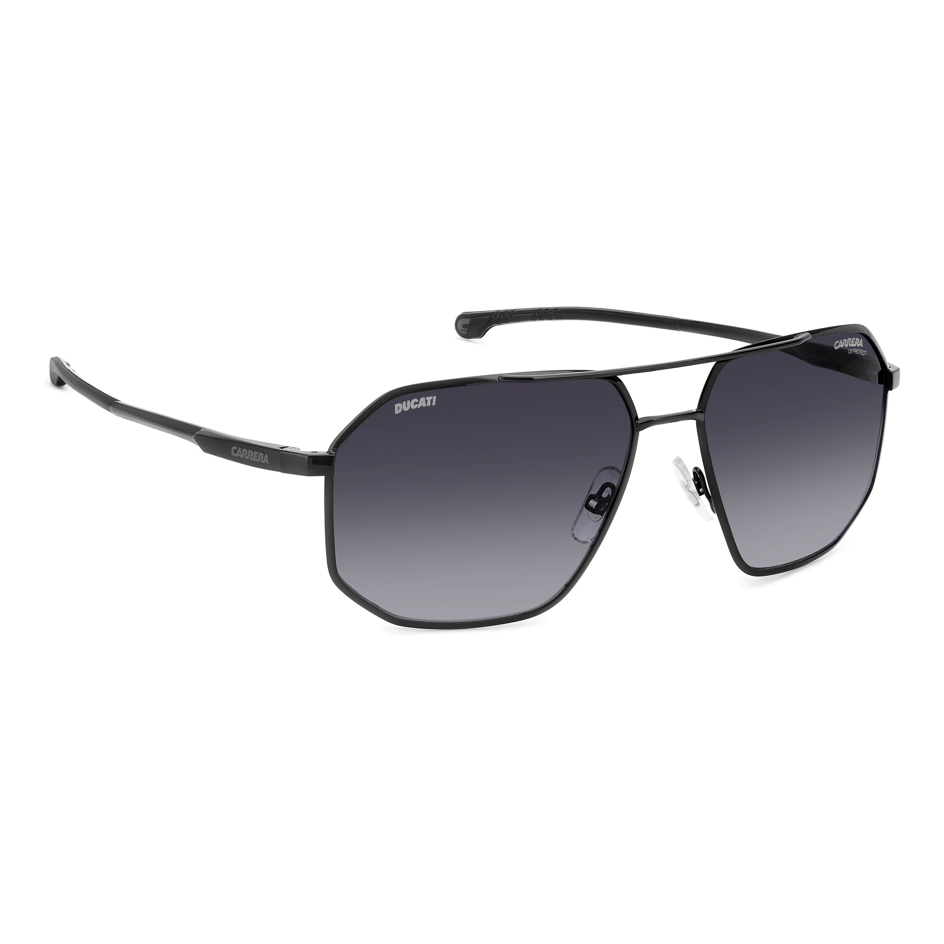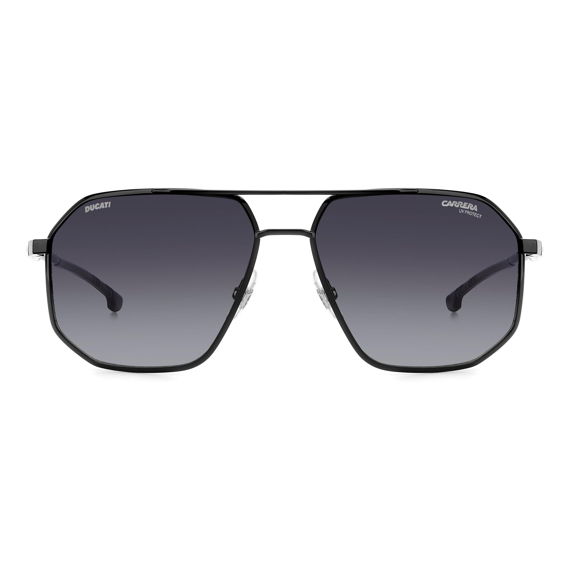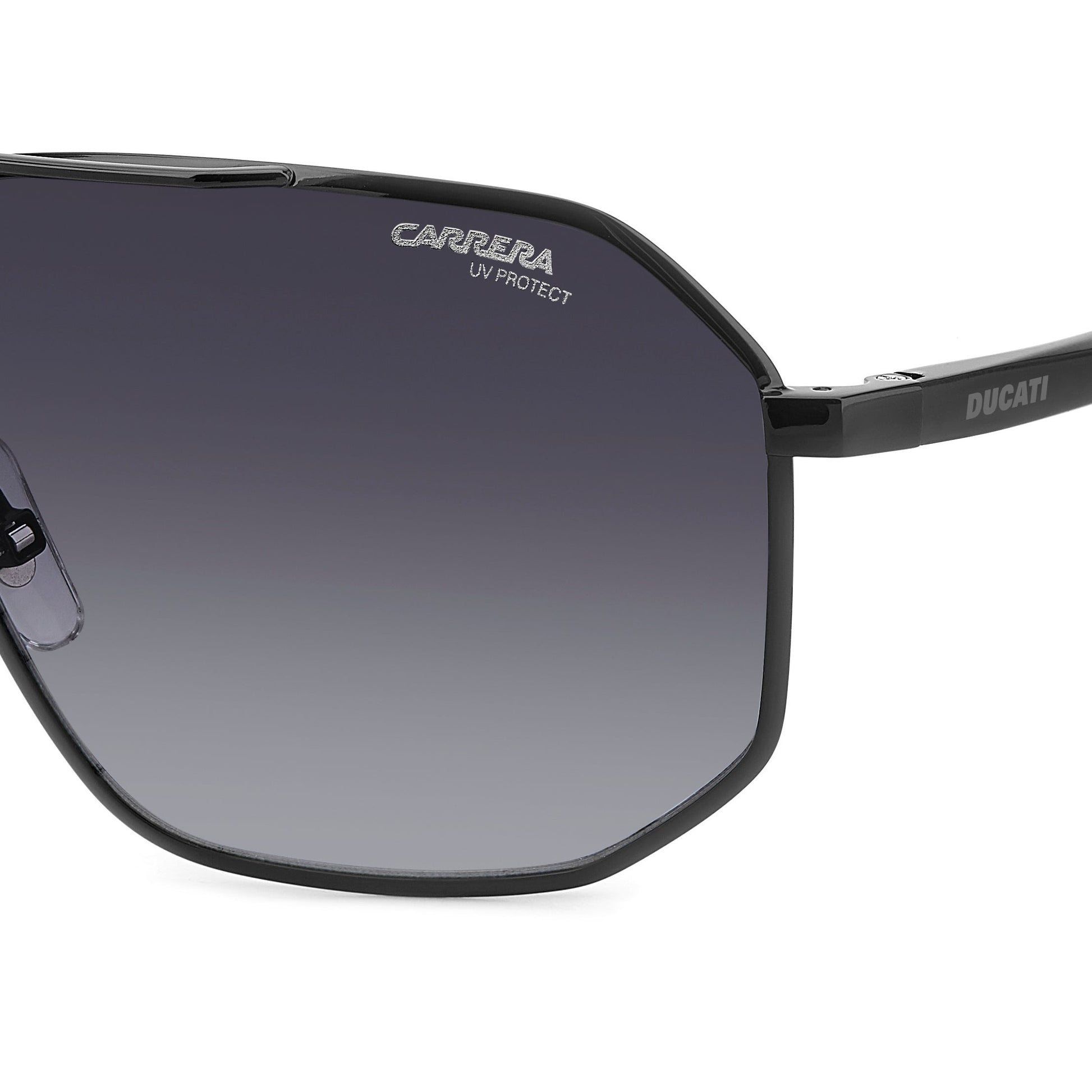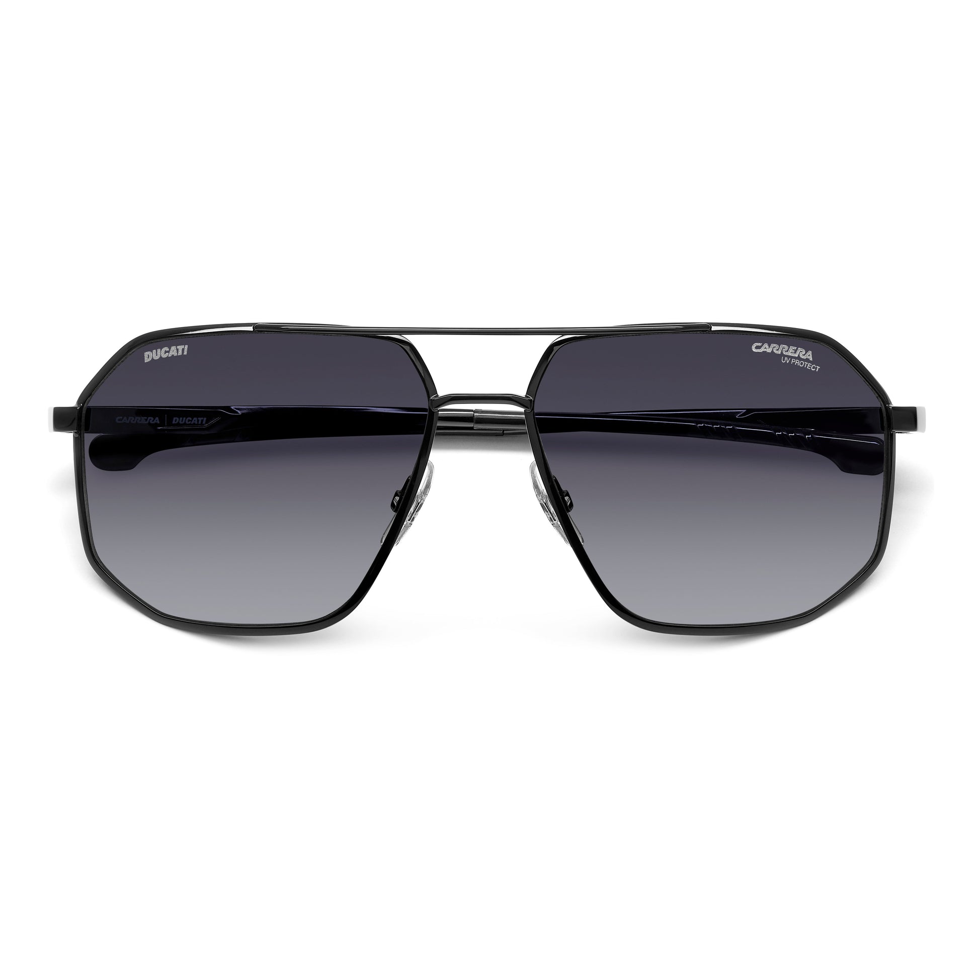 Carrera | Ducati sunglasses set a fast pace towards the future. This style features a navigator shape with Carrera's signature double bridge, and aluminium temples with detailing inspired by the Panigale. The frames tend towards full coverage, given stability thanks to adjustable nose pads and flexible hinges, designed to be worn under a helmet. Mirrored or ultrapolar lenses offer crisp vision out on the road.