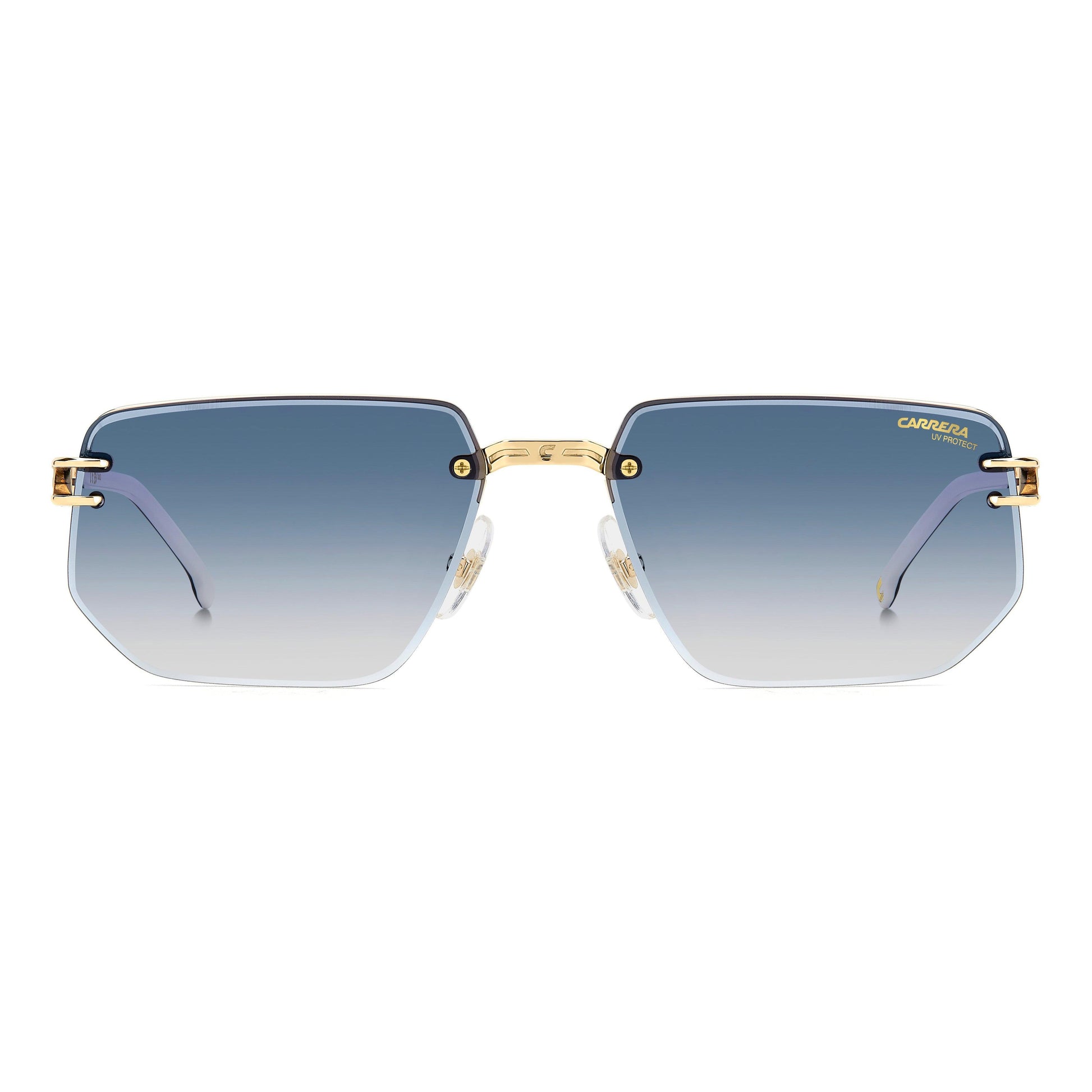 With their iconic character, these Carrera sunglasses make a true statement. The lenses are the protagonists, held onto the structure by visible screws. In a subtle yet powerful detail, an enamel ‘C’ logo trims the bridge. The forked temples are classic Carrera, with an embossed logo and long acetate end tips. Flexible hinges and adjustable nose pads ensure an impeccable fit.