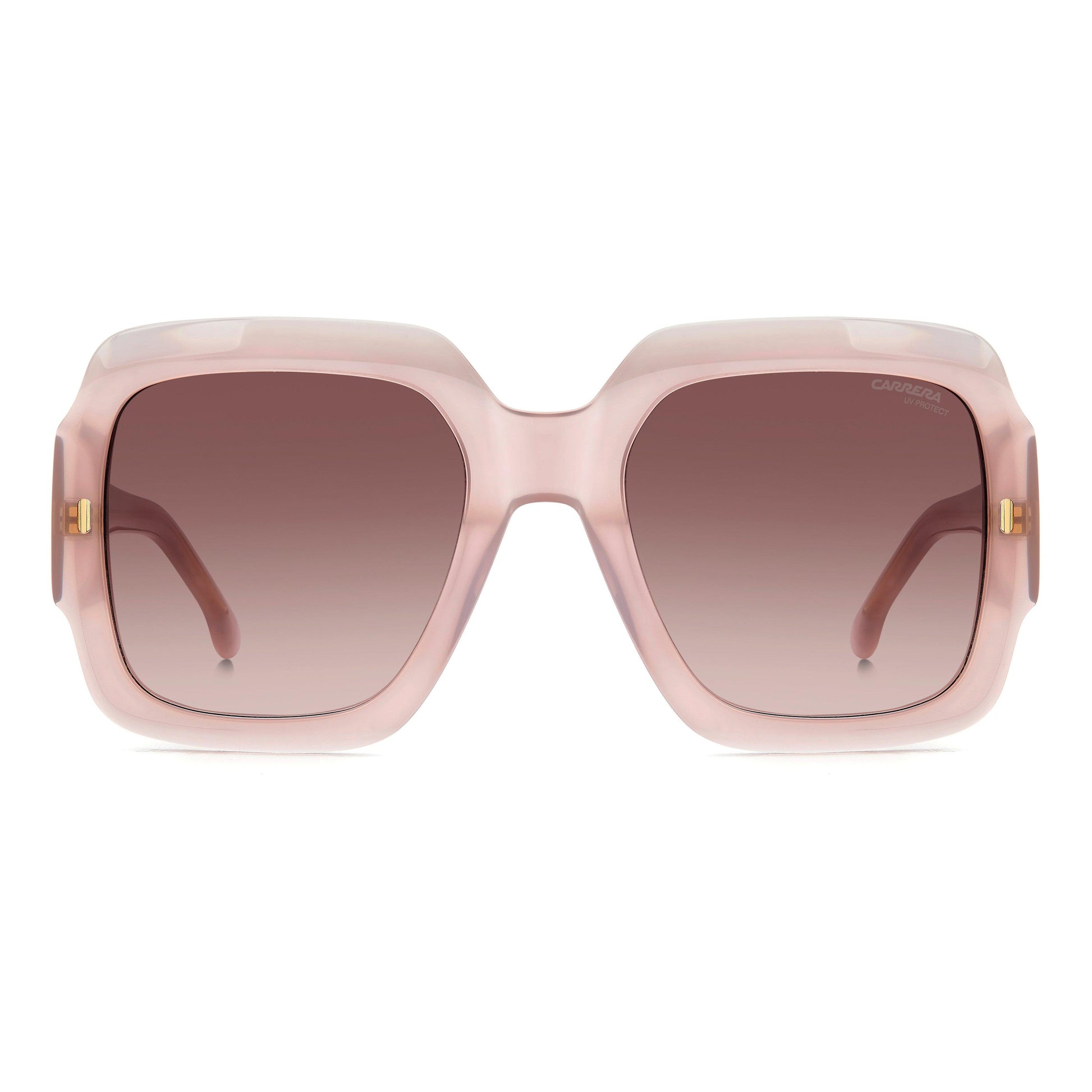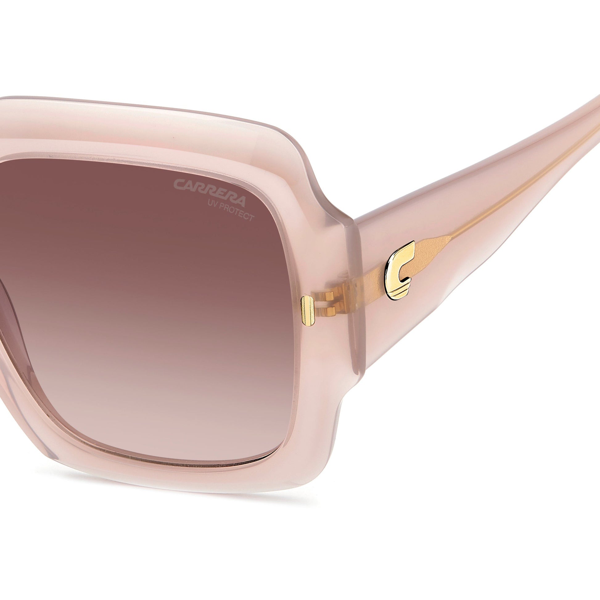 The unmistakable character of Carrera inspired these women’s sunglasses. In acetate, the bold frames are distinguished by a square silhouette and sculptural proportions. The maxi-temples are even more decisive thanks to the prominent raised Carrera ‘C’ detail. These glasses come in an opaline colour palette for feminine allure, including multi-layer options, and they can be fitted with prescription sun lenses.