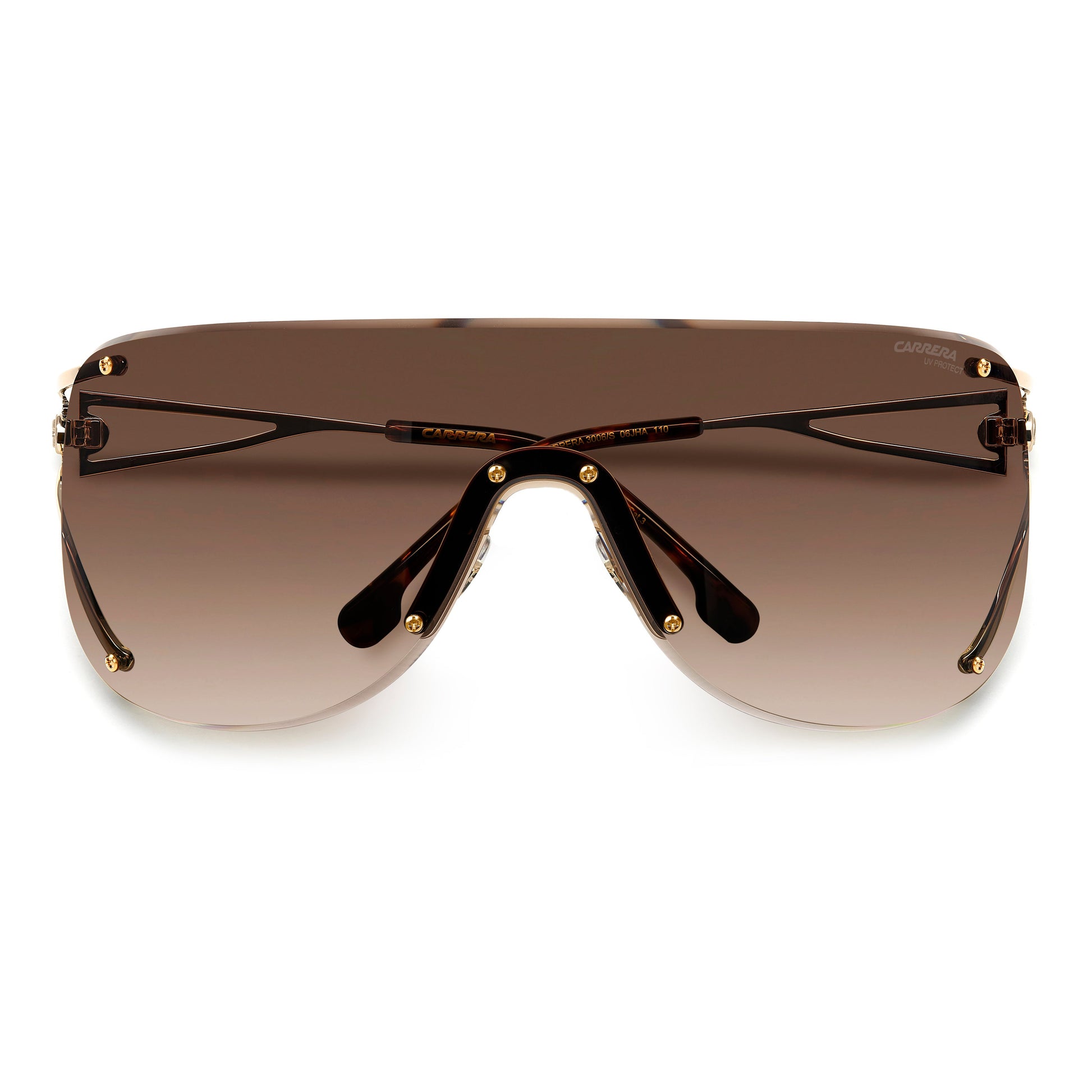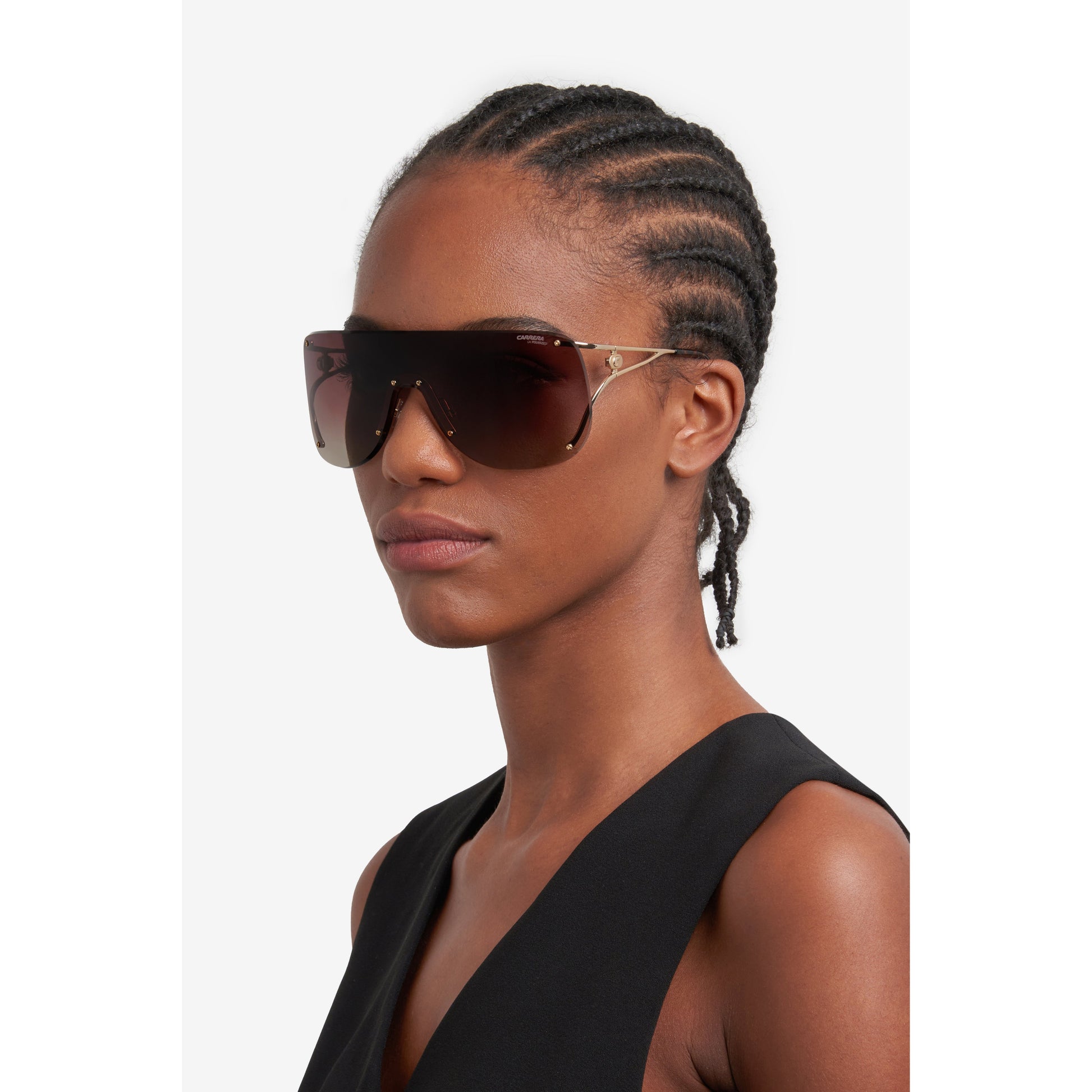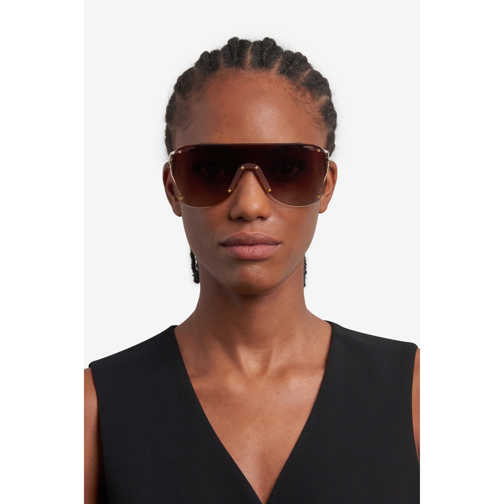 These Carrera women’s sunglasses are sure to be adored by true fans of the brand. The rimless shield front adds must-have wow-factor: a single, full-coverage lens, decorated by visible screws that are both functional and decorative. The temples are fine-design gems, with a forked silhouette connected by a suspended logo. This style comes in an elegant range of contemporary colours.