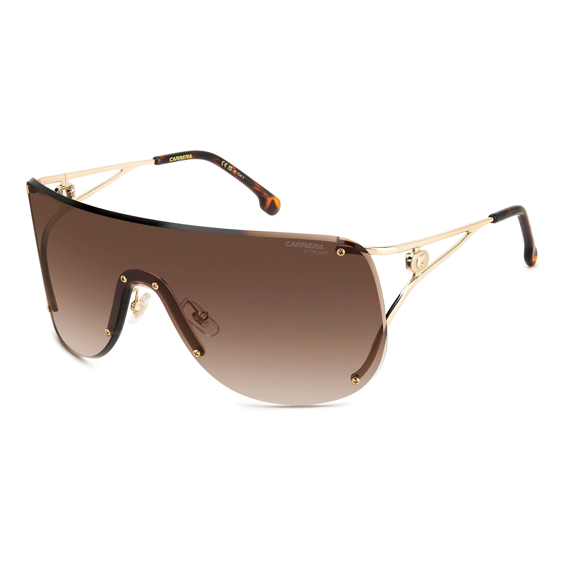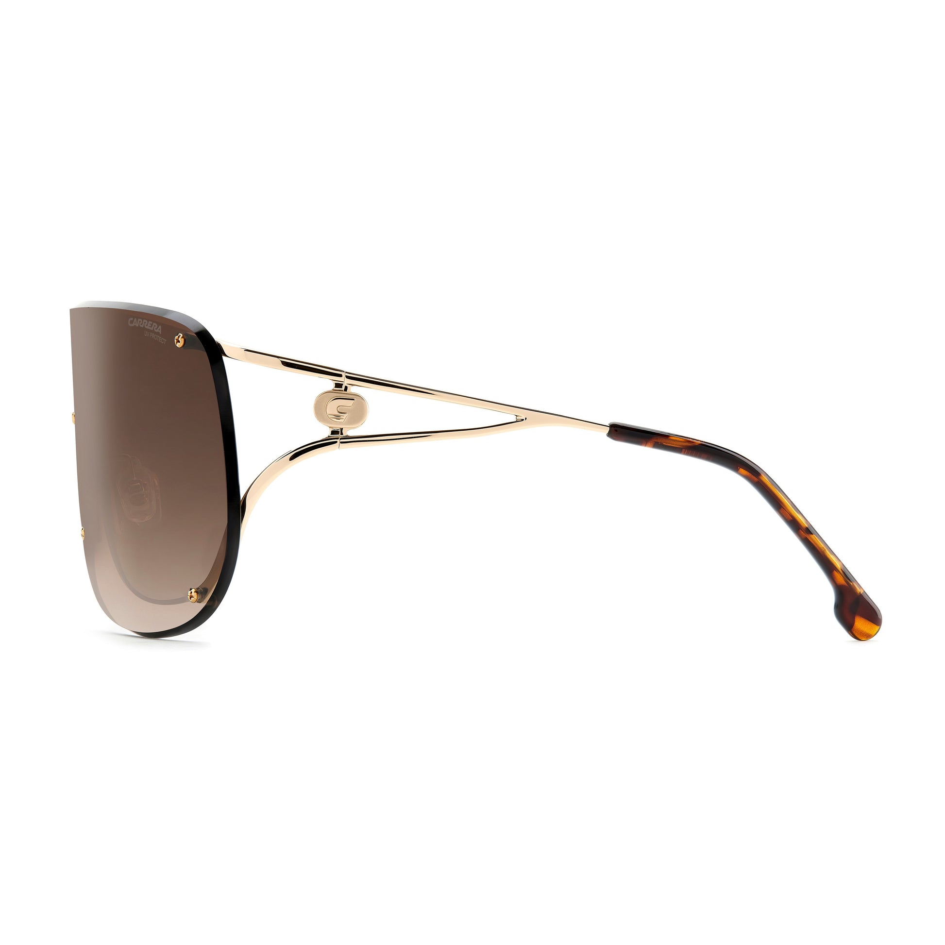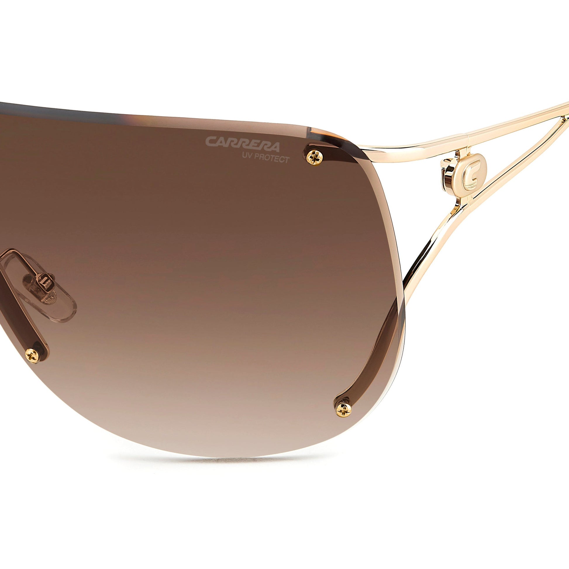 These Carrera women’s sunglasses are sure to be adored by true fans of the brand. The rimless shield front adds must-have wow-factor: a single, full-coverage lens, decorated by visible screws that are both functional and decorative. The temples are fine-design gems, with a forked silhouette connected by a suspended logo. This style comes in an elegant range of contemporary colours.