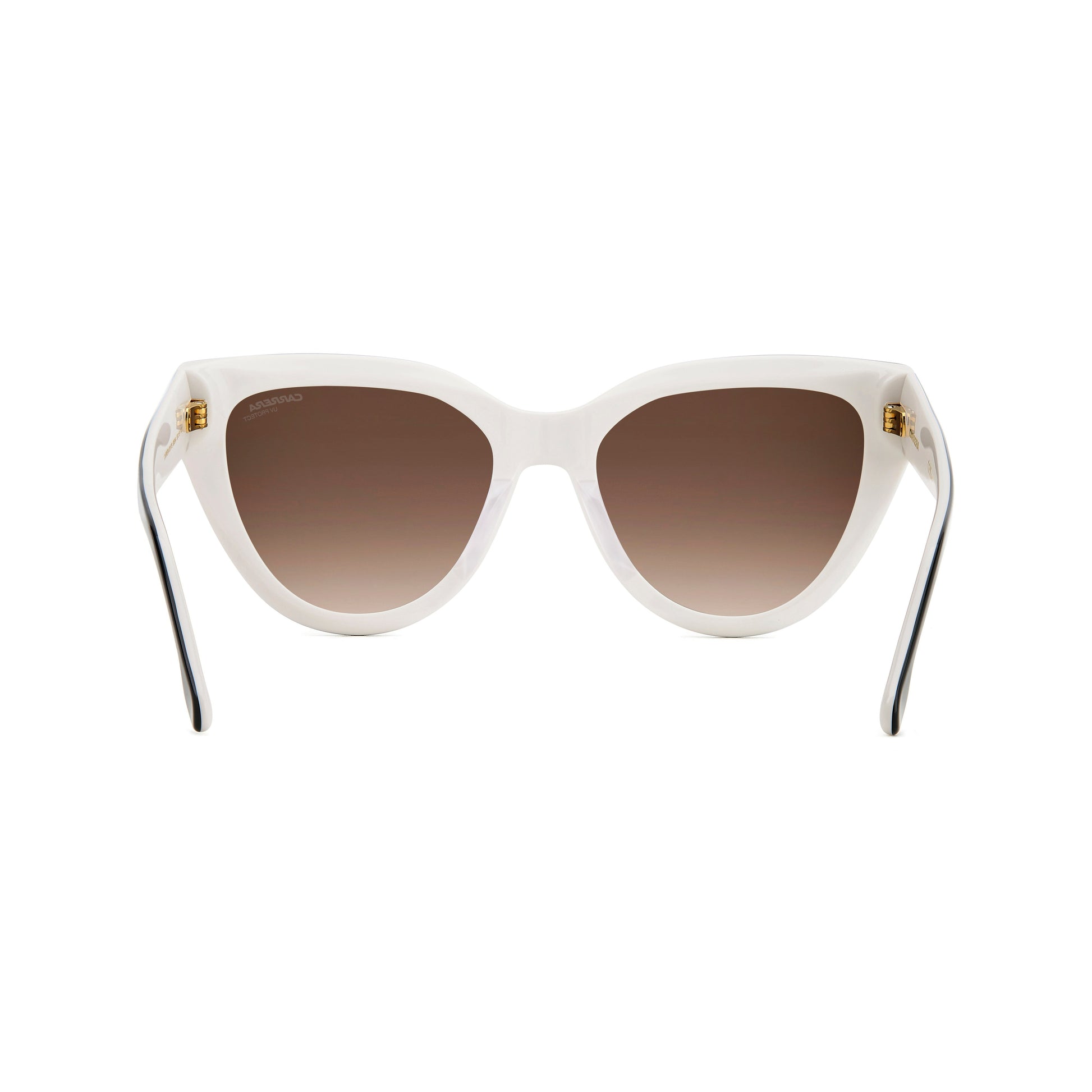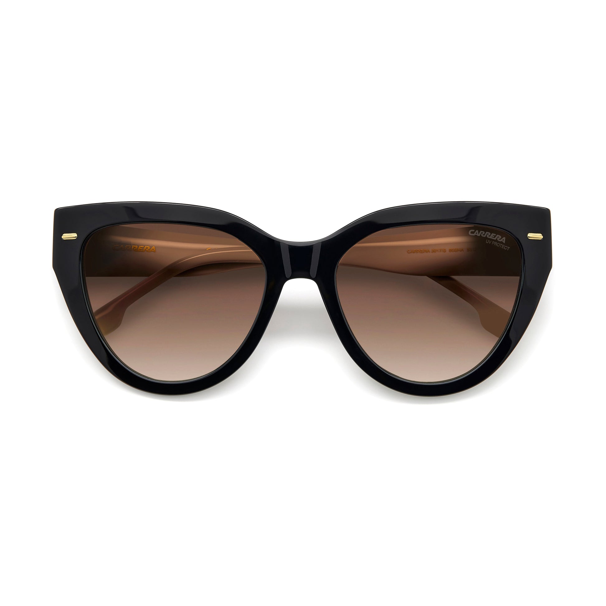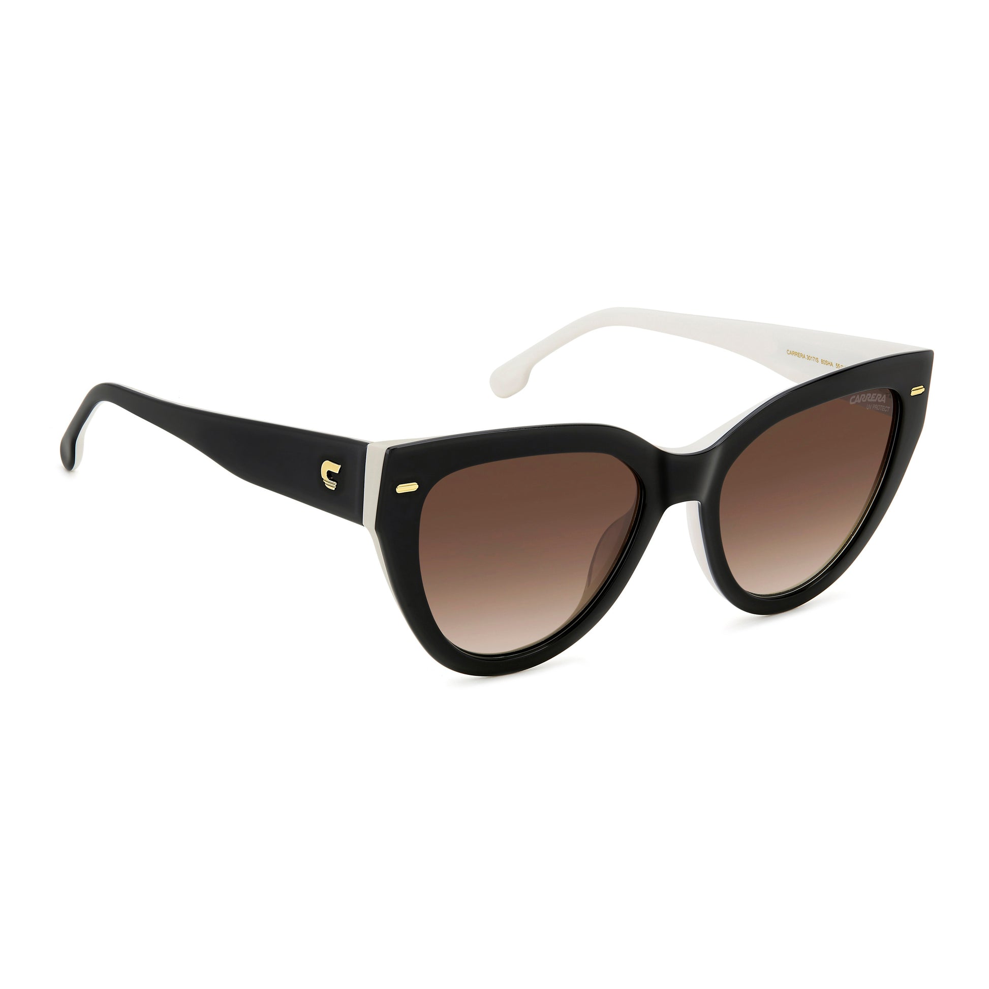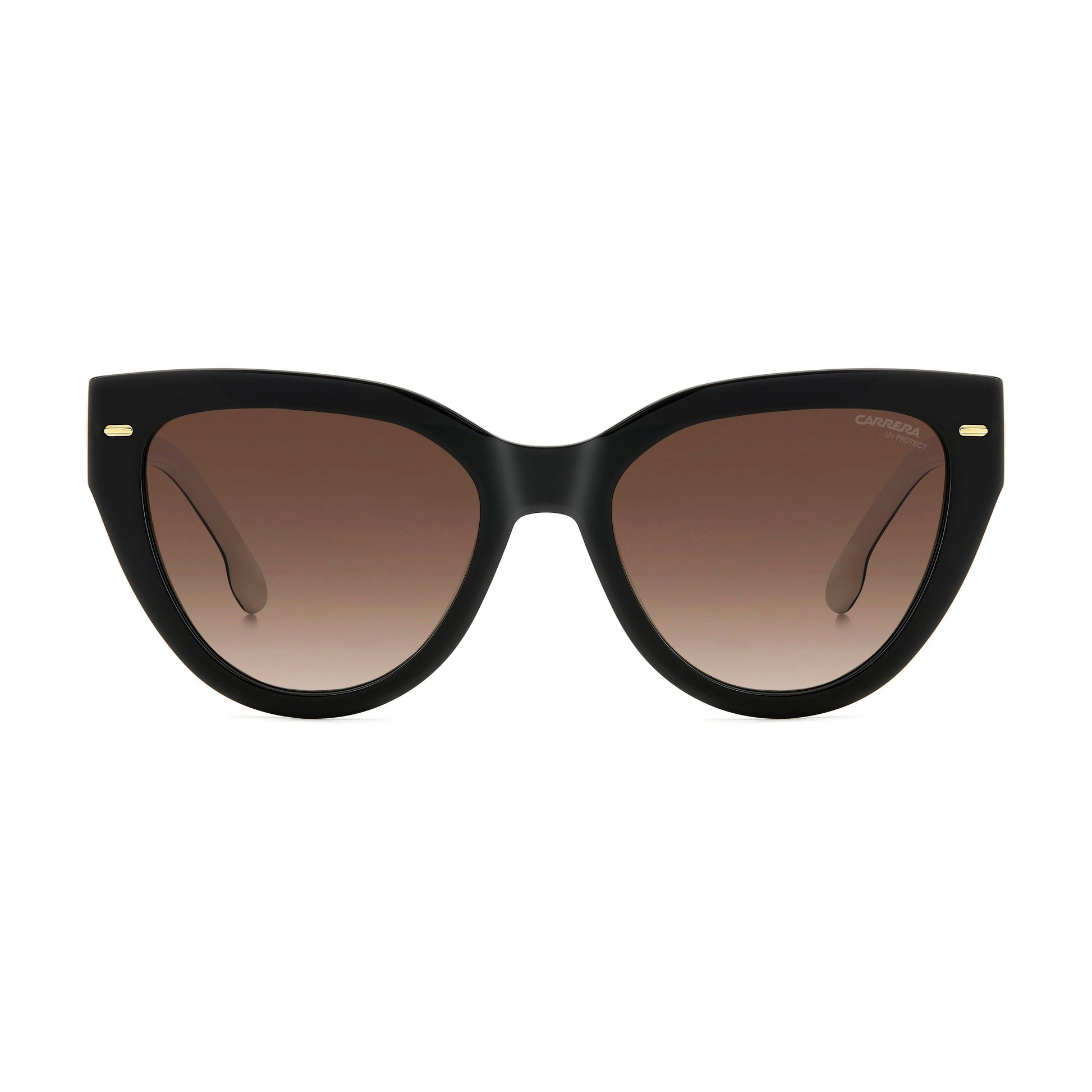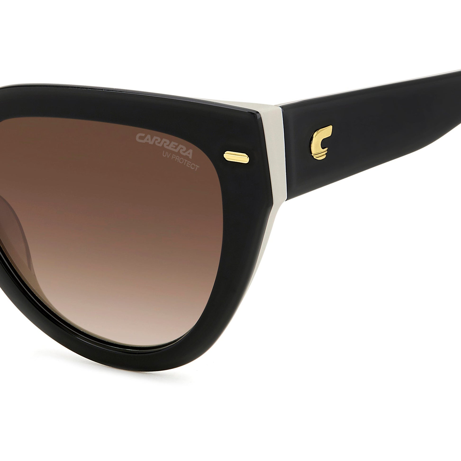 Carrera updates the most elegant eyewear shape, the cat eye, with these boldly proportioned sunglasses. Metal details shimmer on the acetate frames like small gems, including the frontal rivets and the iconic ‘C’ in relief on each temple. The gradient sun lenses, which are prescription-friendly, protect the eyes and face.
