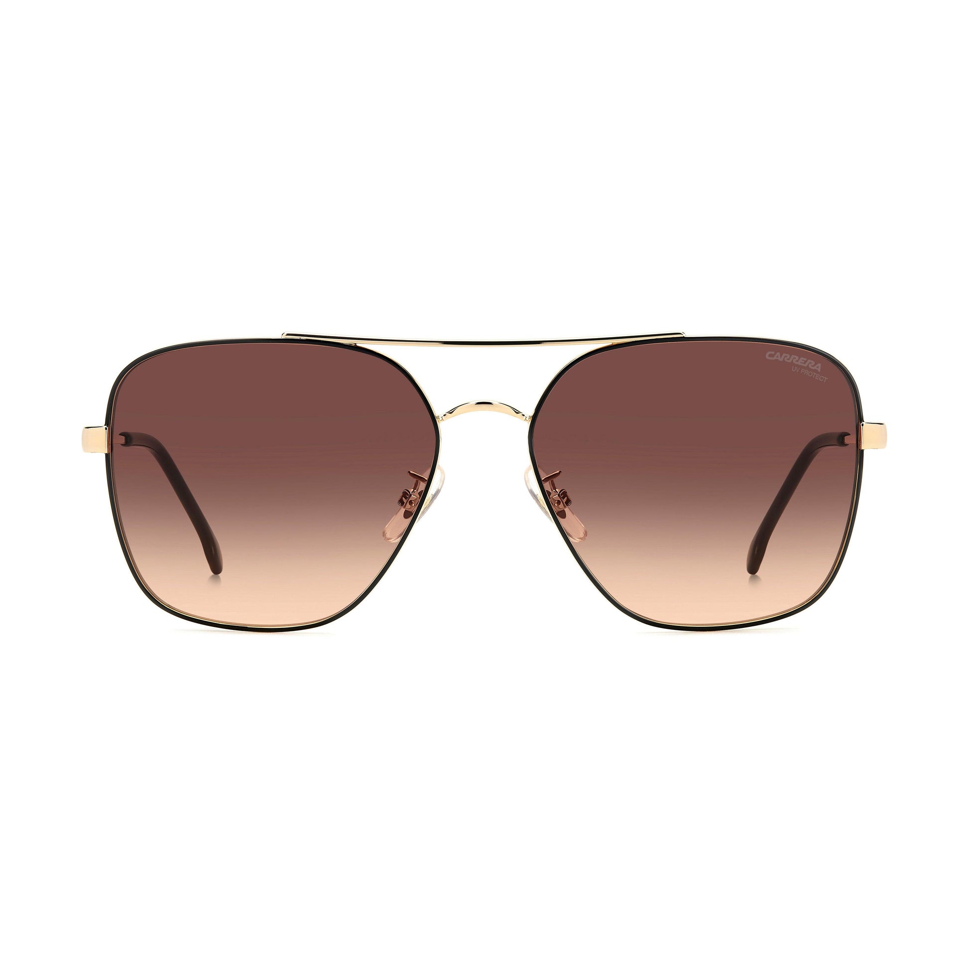 These women's sunglasses interpret Carrera heritage in a new, sophisticated way. The metal structure is characterised by a distinct double bridge and slender temples with acetate end tips, including a transparent version. It’s a style to flaunt with a carefree attitude thanks to lightweight construction, comfortable nose pads, and the option to use prescription sun lenses. Also available with coloured trim on the front and with polarized lenses.