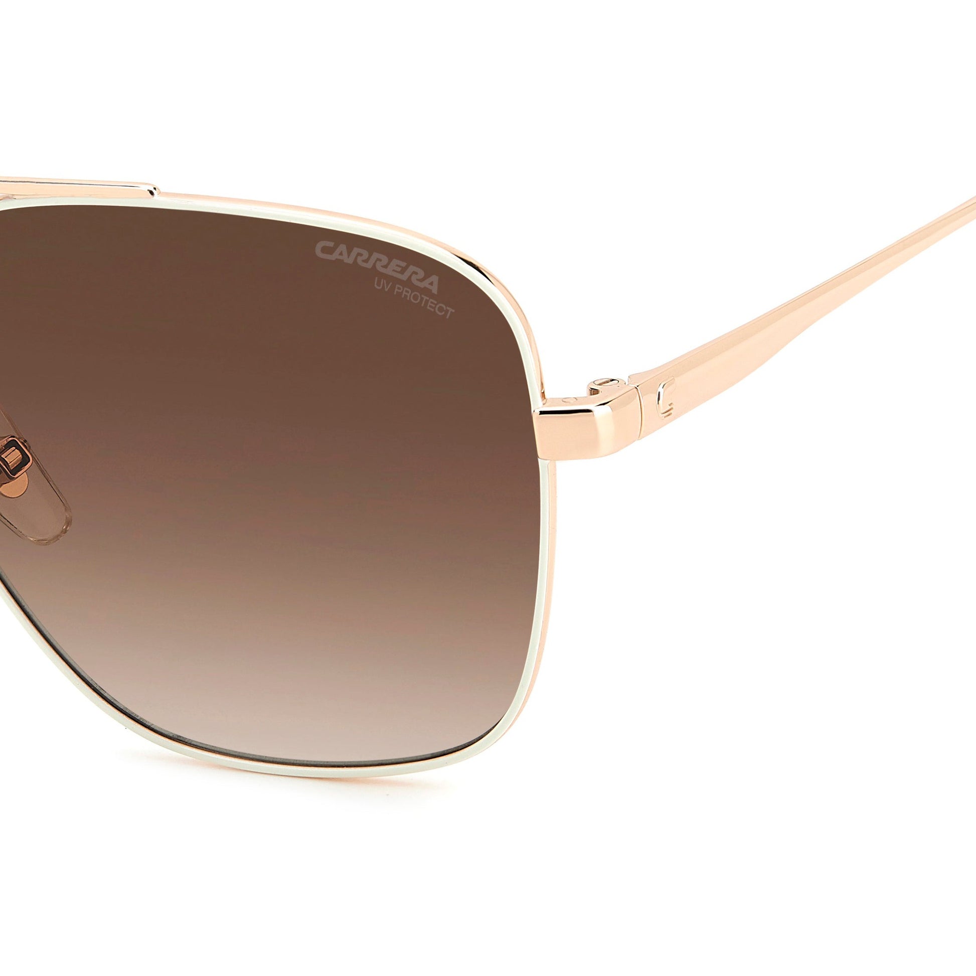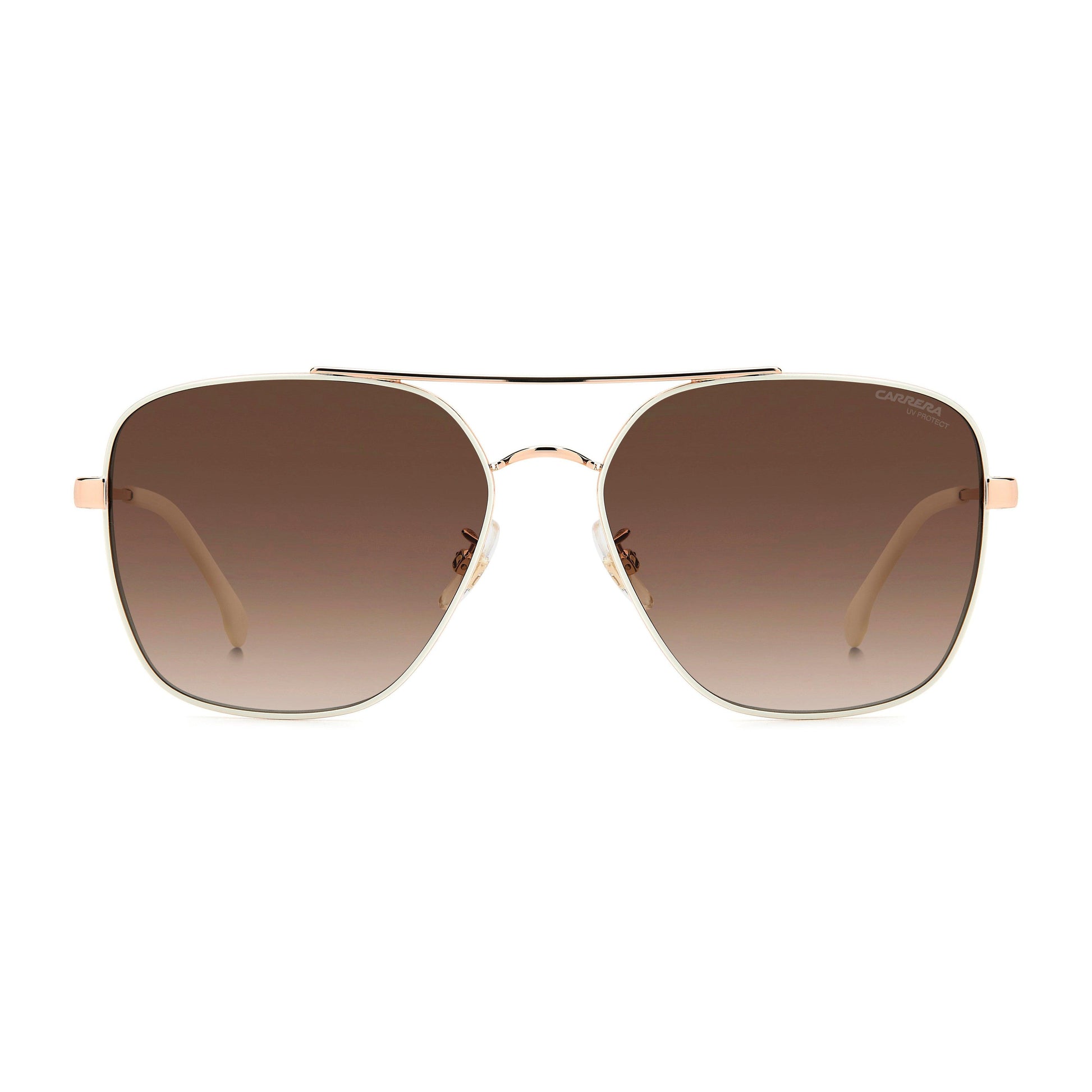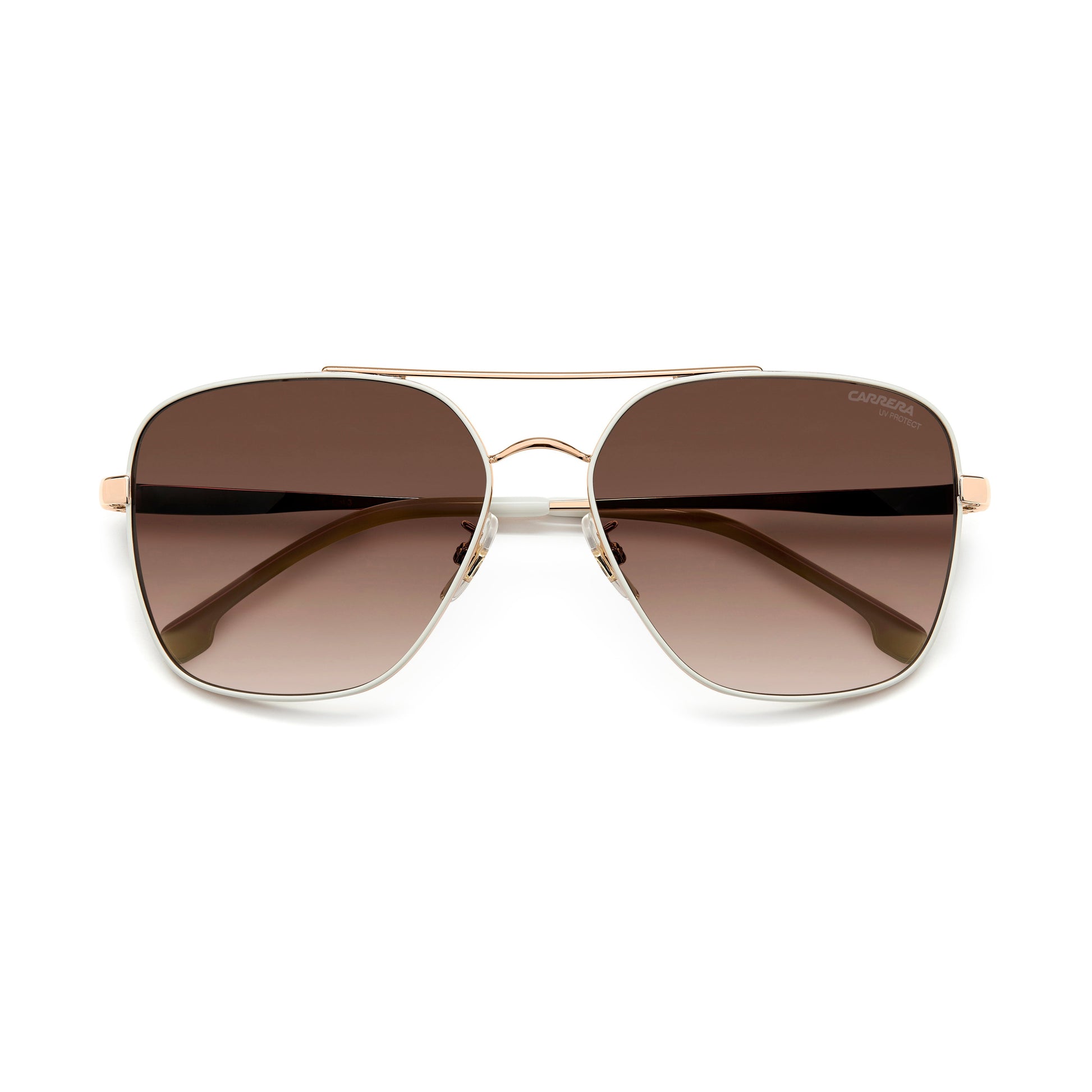 These women's sunglasses interpret Carrera heritage in a new, sophisticated way. The metal structure is characterised by a distinct double bridge and slender temples with acetate end tips, including a transparent version. It’s a style to flaunt with a carefree attitude thanks to lightweight construction, comfortable nose pads, and the option to use prescription sun lenses. Also available with coloured trim on the front and with polarized lenses.