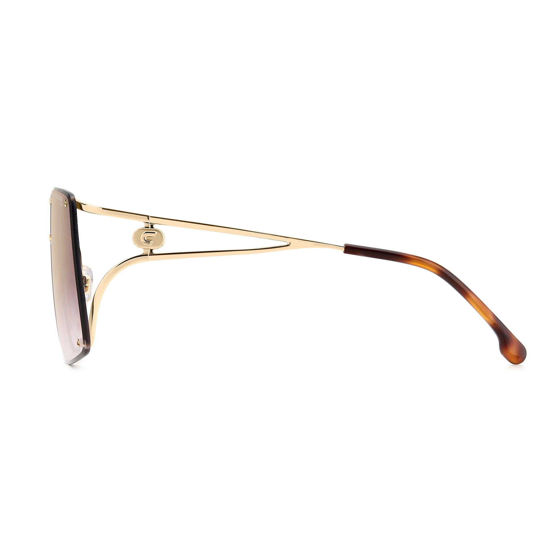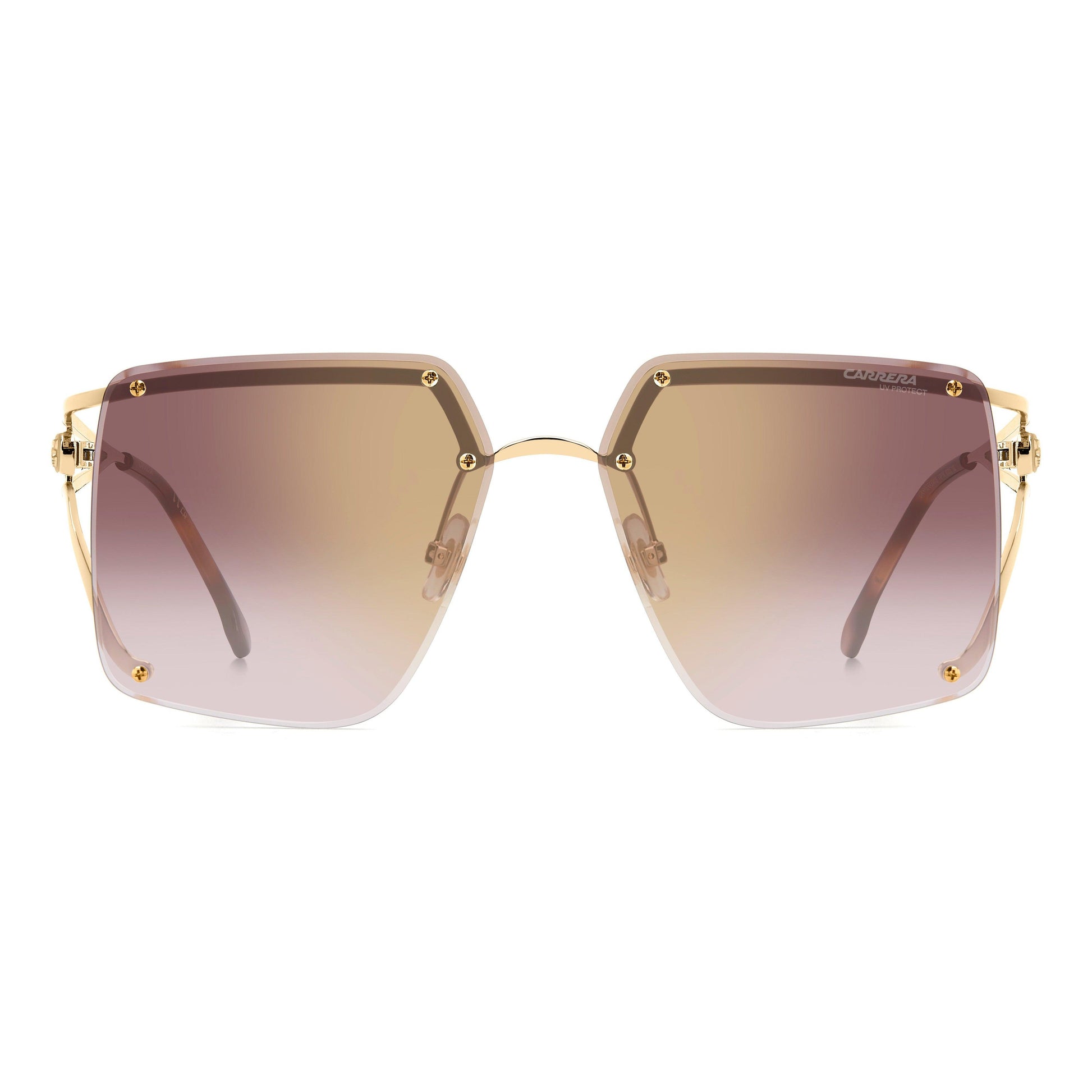 Carrera connoisseurs will adore these women's sunglasses. The rimless front, with colour-gradient lenses, is undeniably hypnotic, the star of any look. No detail has been left to chance: the screws that connect to the bridge and the temples are functional and decorative. The forked temple design, embellished by a suspended logo with an embossed ‘C’, is unforgettable. Sophisticated hues complete this unmistakably Carrera accessory.