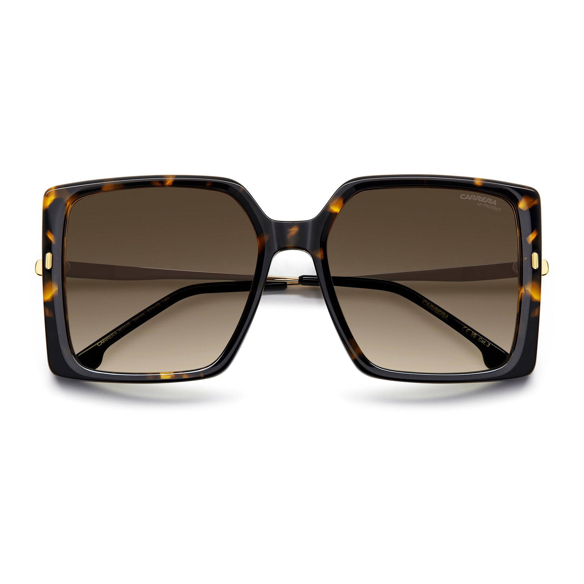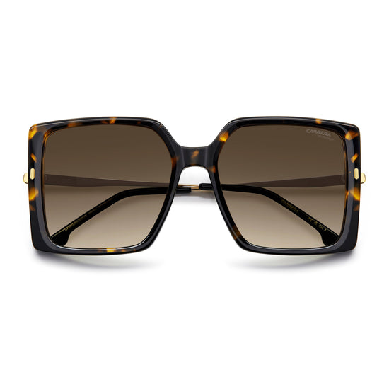 These Carrera sunglasses express refined style. The oversized butterfly frame is made to stand out, bold but balanced by slim metal temples. The front comes in several colors, including a version with tonal inserts on the top and bottom. The polarized lenses offer extra protection.