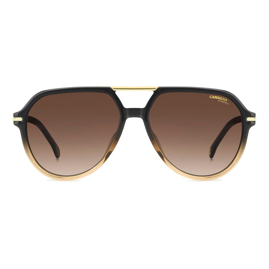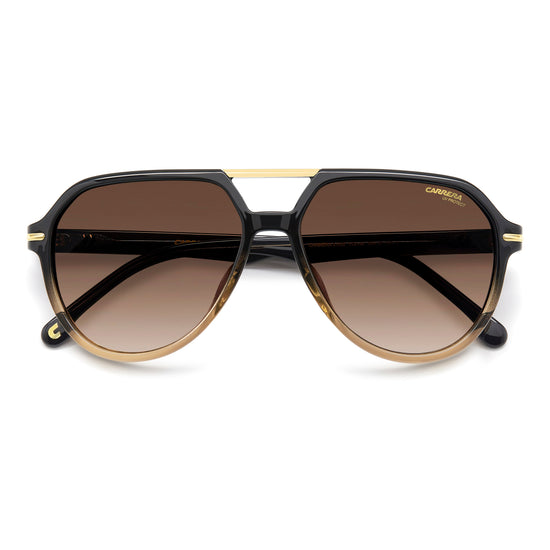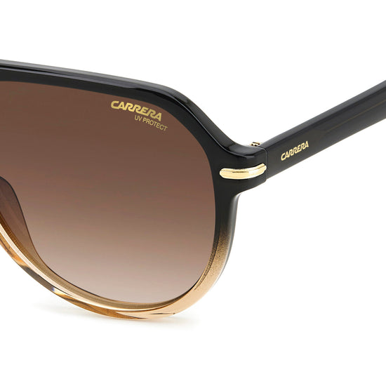 Sunglasses that abound in references to Carrera heritage, but with a contemporary, cosmopolitan twist. Their aesthetic force arises from the pilot frames which are connected by a top bar in metal, in the perfect balance of lines and materials. The point where the front connects to the fin temples is accented by a metal insert with a raised ‘C’. The frames can be fitted with prescription lenses, and various versions are available: clear, gradient, multi-layer and with ultrapolar lenses.