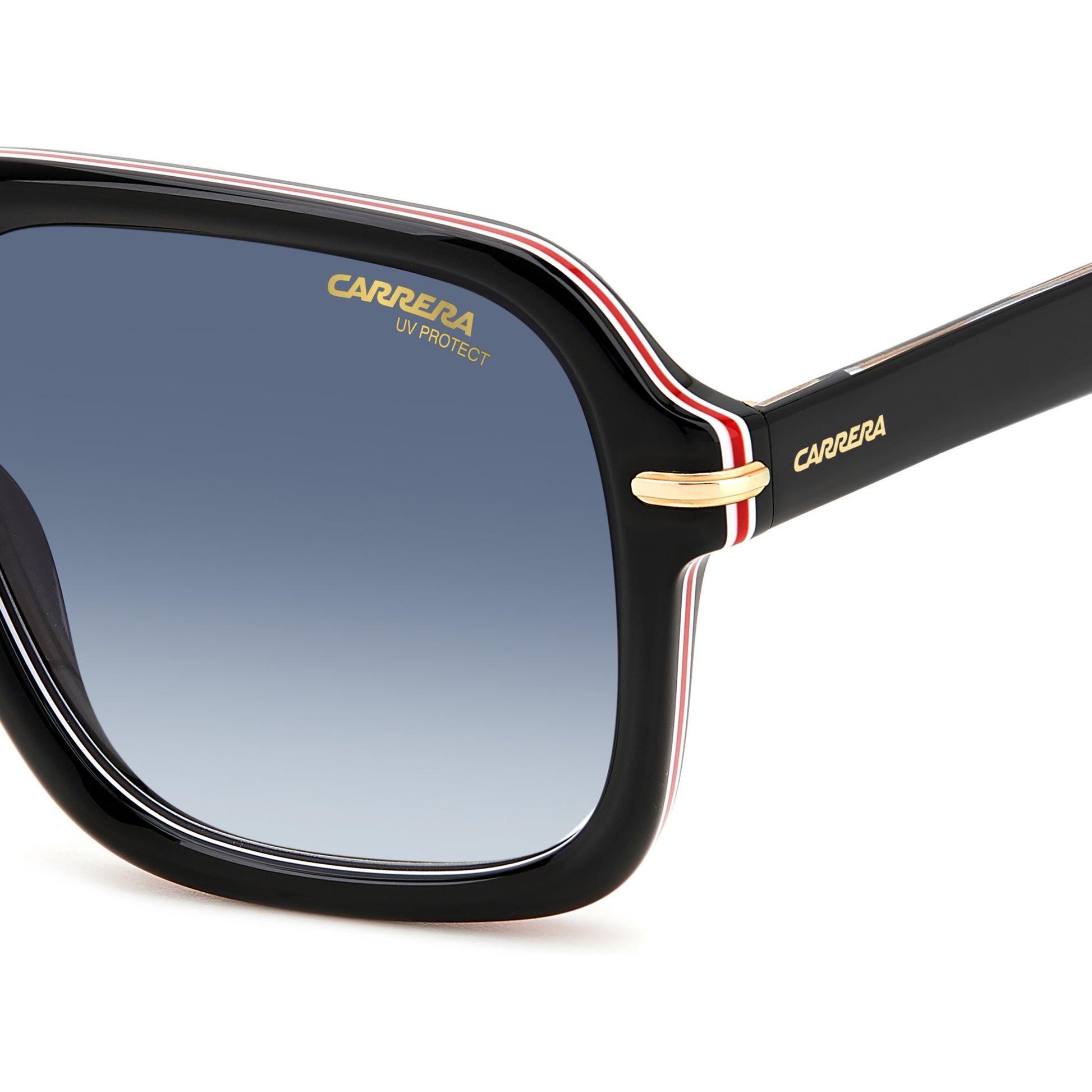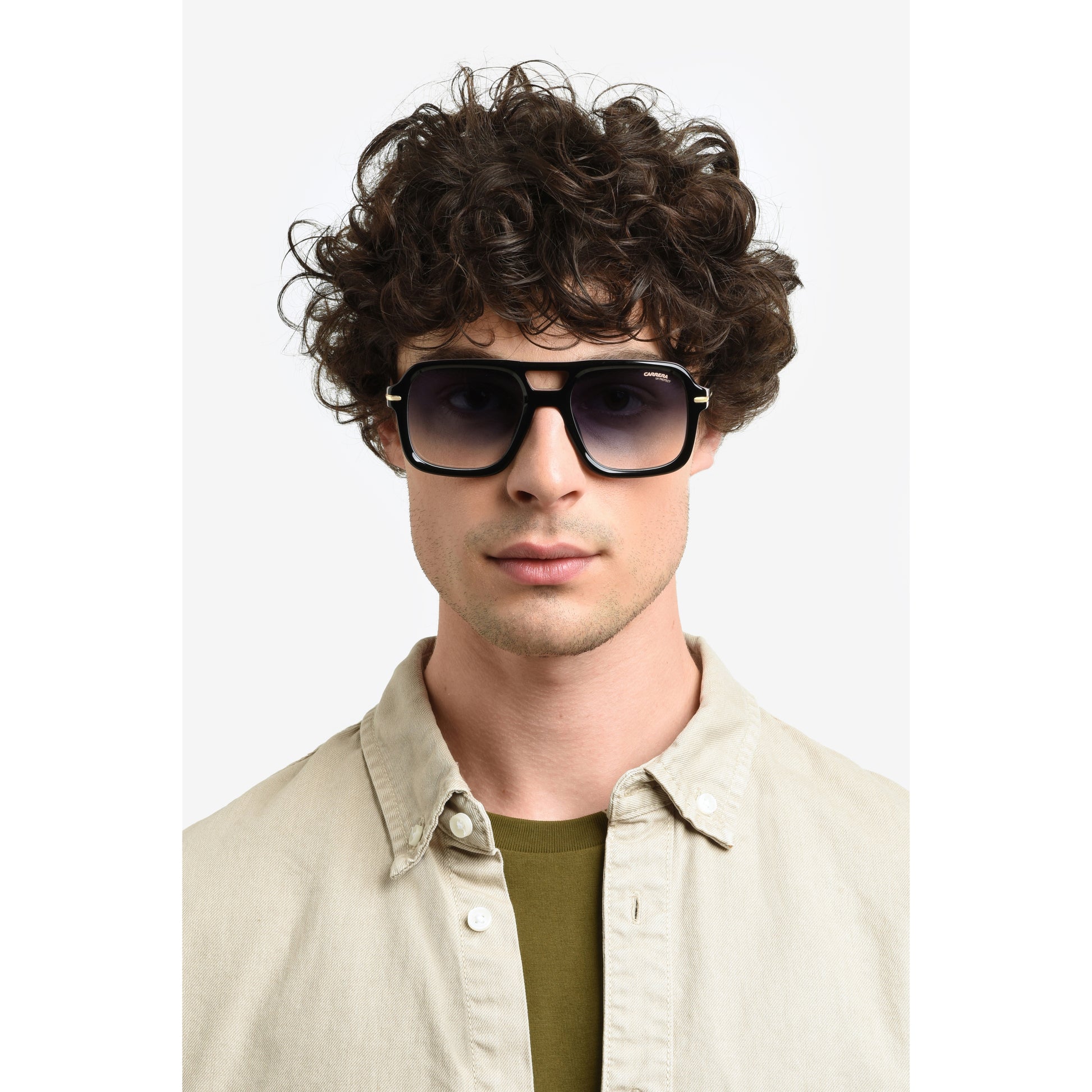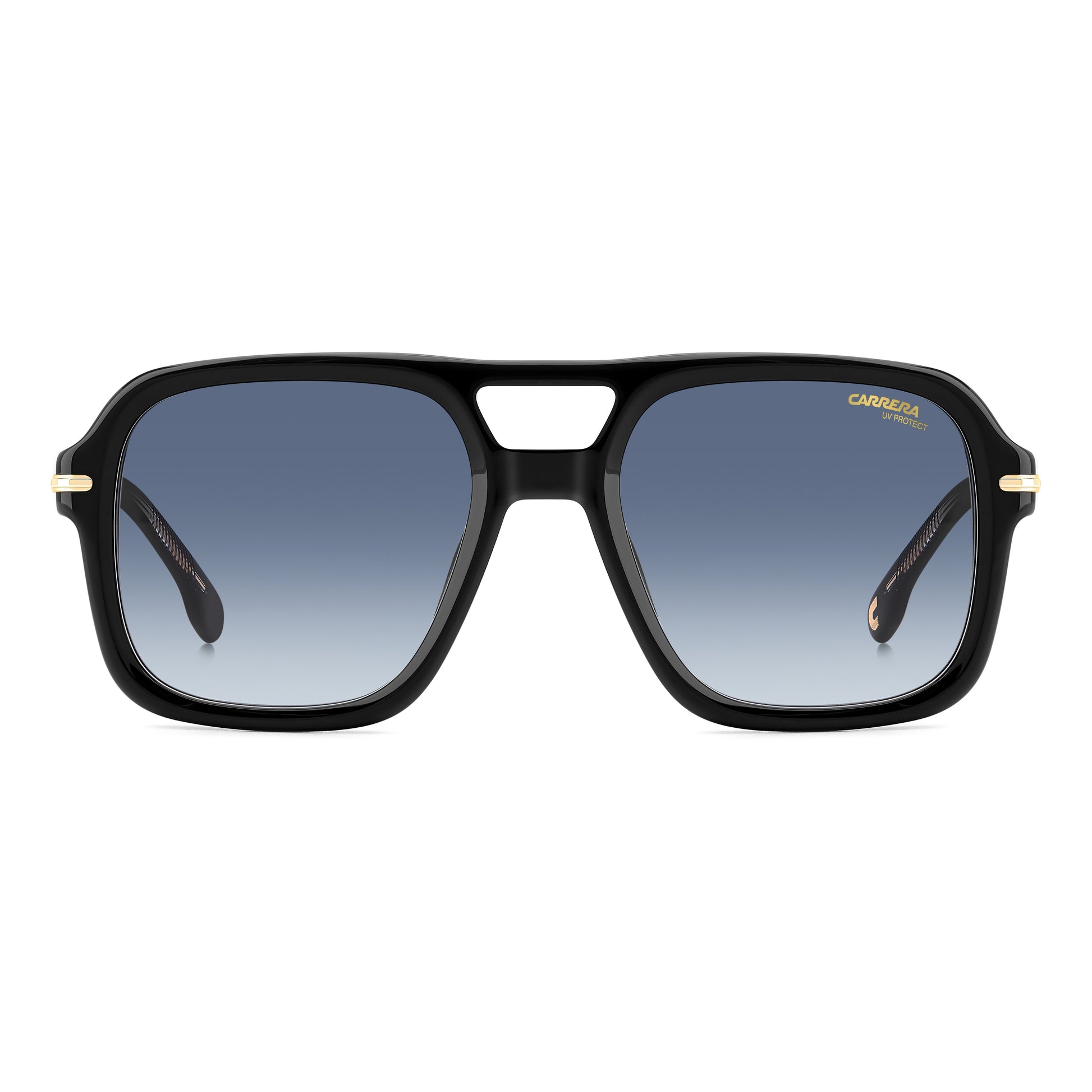The spotlight is on these bold sunglasses with prominent, sculpted proportions. Embracing one of Carrera’s most popular styles (the double-bridge navigator), here the frames are in acetate with raised metal inserts at each side, complemented by slender temples. The colourways include a multi-layer option and transparent versions with a visible textural core. These glasses can be fitted with prescription lenses.