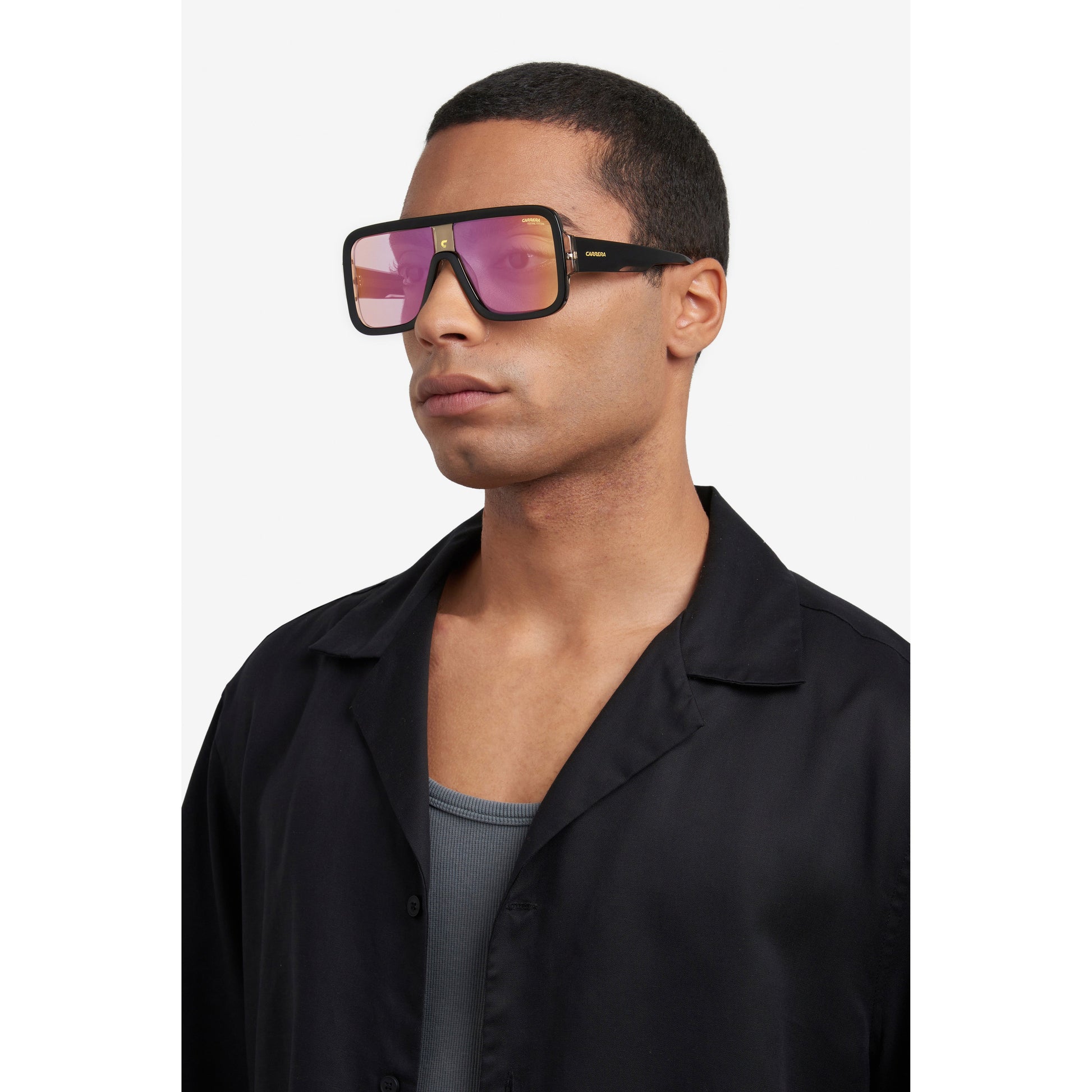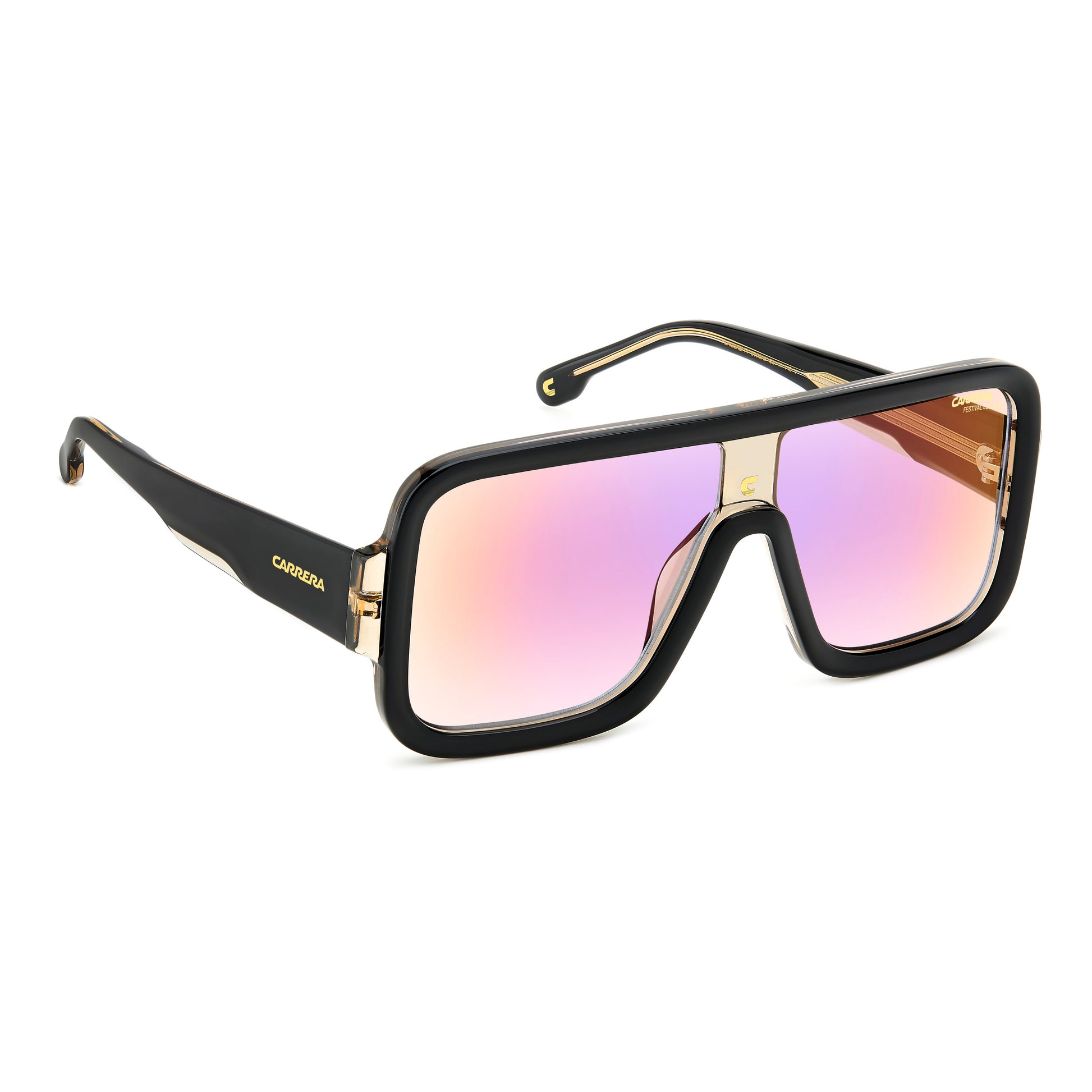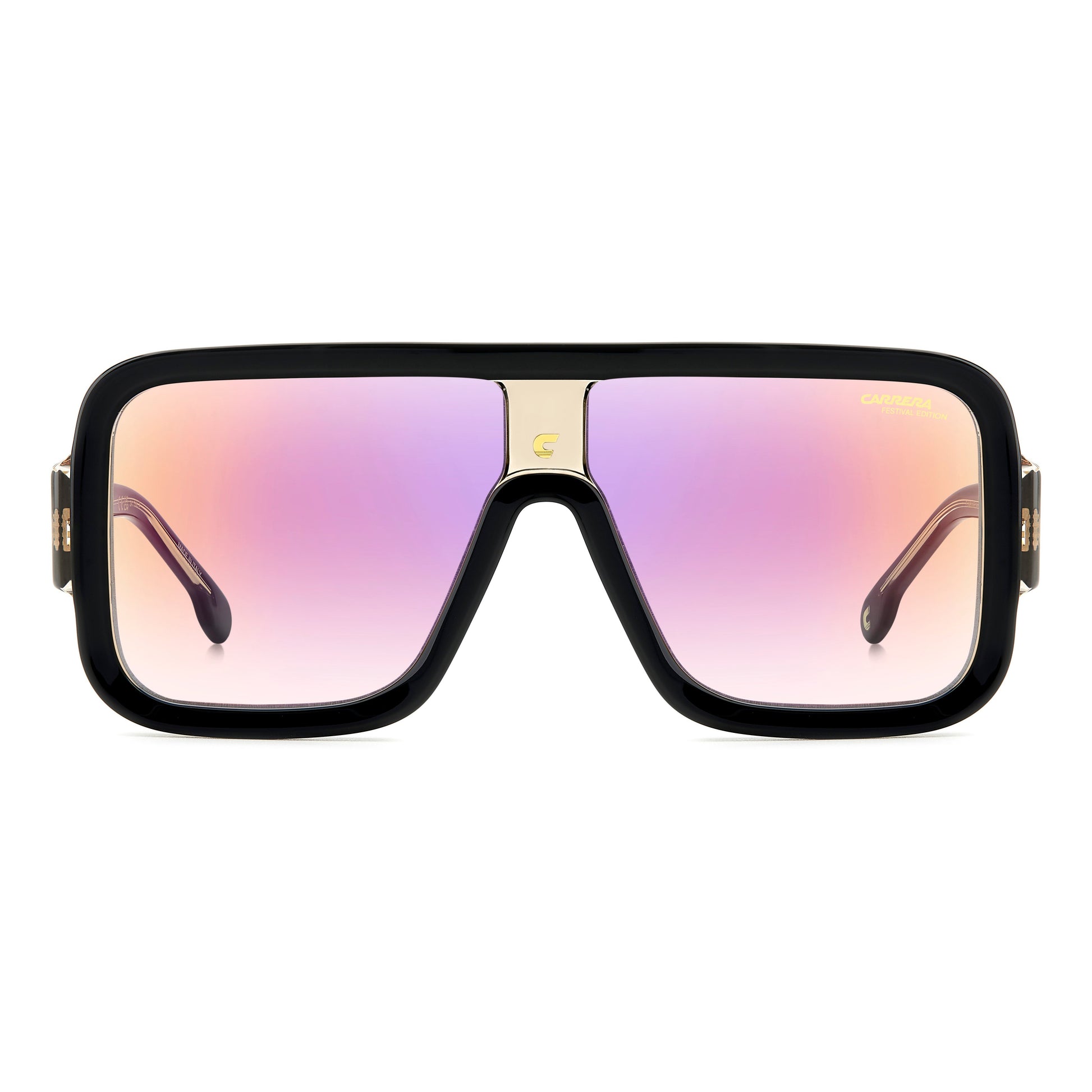 These Carrera sunglasses are part of a special capsule collection dedicated to festivals. The Flag Lab collection pushes Carrera to new limits of originality. The distinct mask shape, complete with bold acetate profiles and Carrera 'C' plaque on the bridge, gives this model a futuristic allure. The maxi temples are characterised by a game of transparencies that allow the metal core to show through, while proudly displaying the lettering logo and Festival Edition. The iridescent lenses are perfectly on-trend, a must-have!