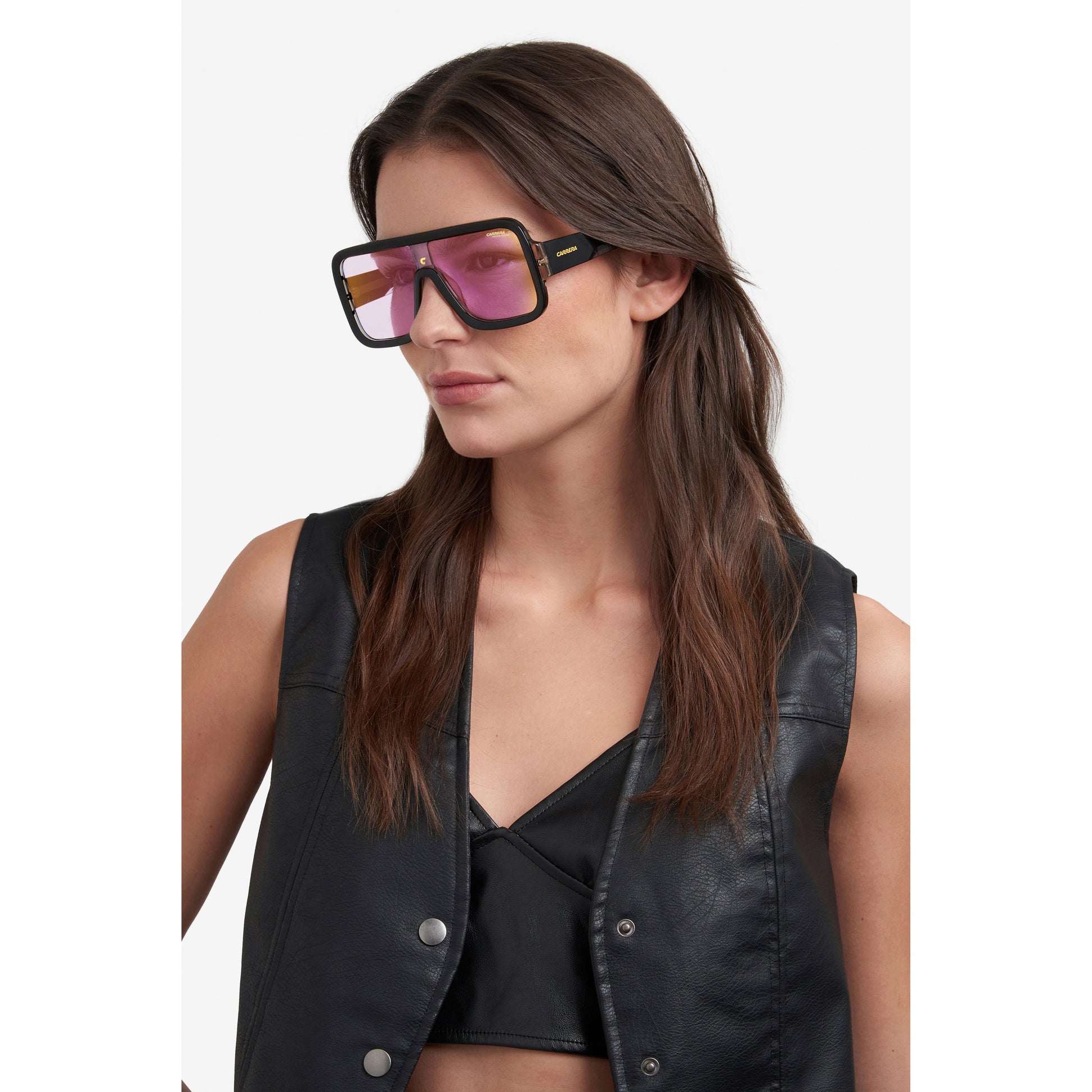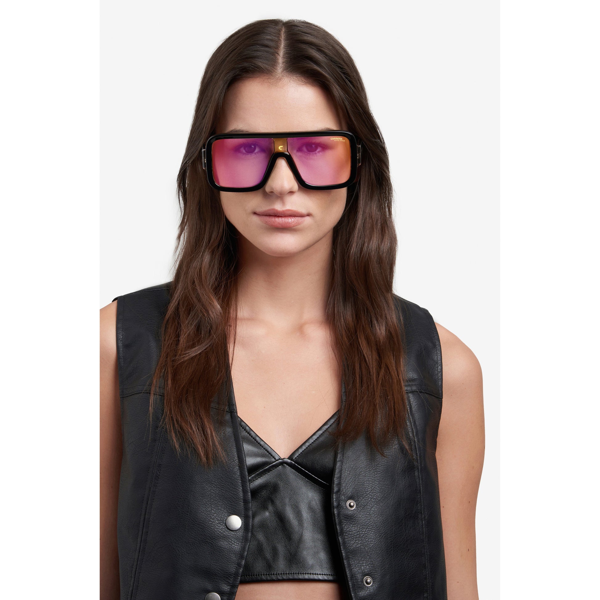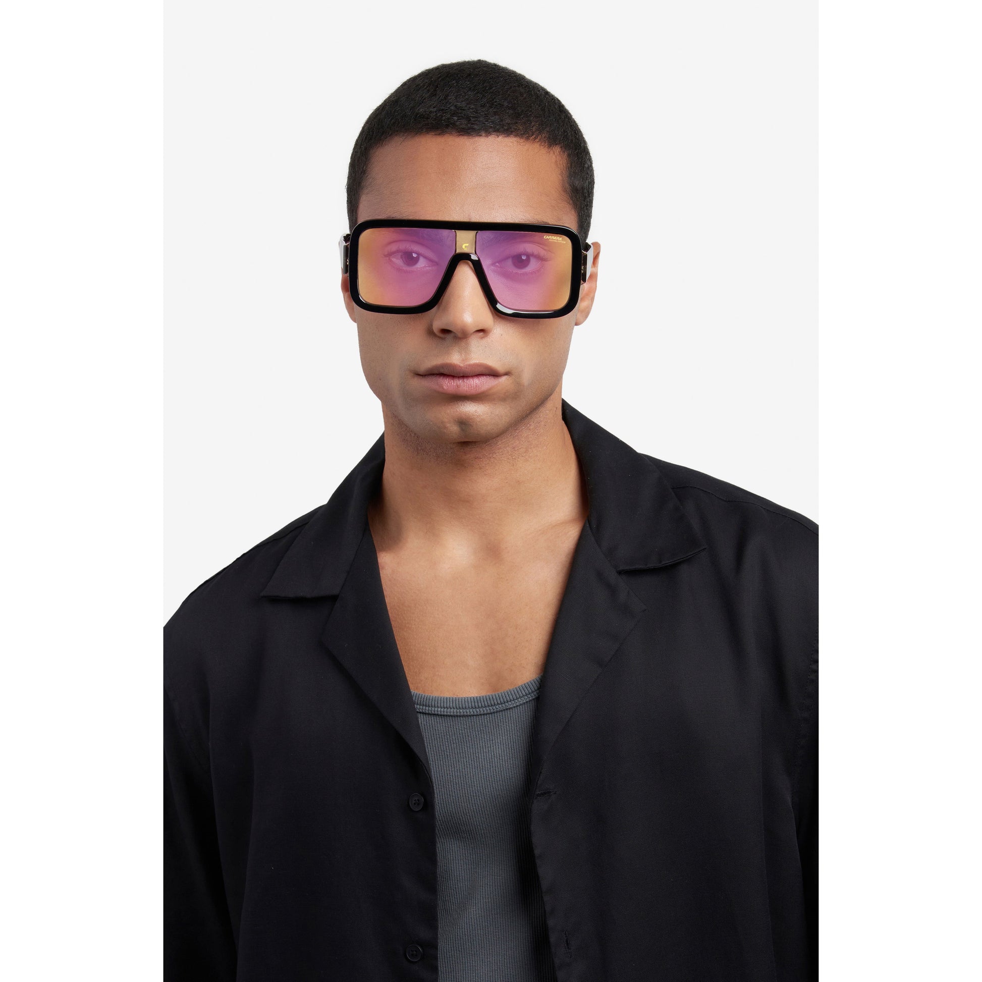 These Carrera sunglasses are part of a special capsule collection dedicated to festivals. The Flag Lab collection pushes Carrera to new limits of originality. The distinct mask shape, complete with bold acetate profiles and Carrera 'C' plaque on the bridge, gives this model a futuristic allure. The maxi temples are characterised by a game of transparencies that allow the metal core to show through, while proudly displaying the lettering logo and Festival Edition. The iridescent lenses are perfectly on-trend, a must-have!