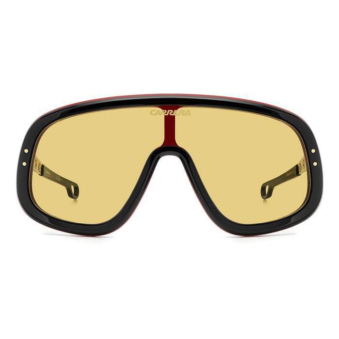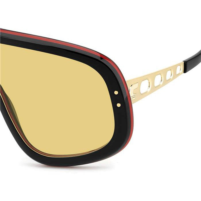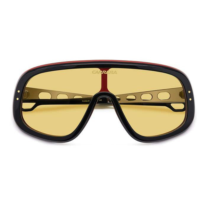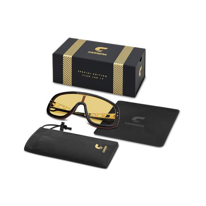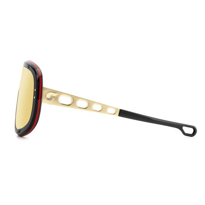 These Carrera sunglasses bring a sporty attitude to fashion. The shield front is profiled by acetate, printed with a logo on the lens. The temples are a true gem: their round vents echo the design of the steering wheels on the classic cars which raced in the Carrera Panamericana. Versions with yellow or orange lenses give rise to a truly evocative look. This collector's item comes with its own special packaging.