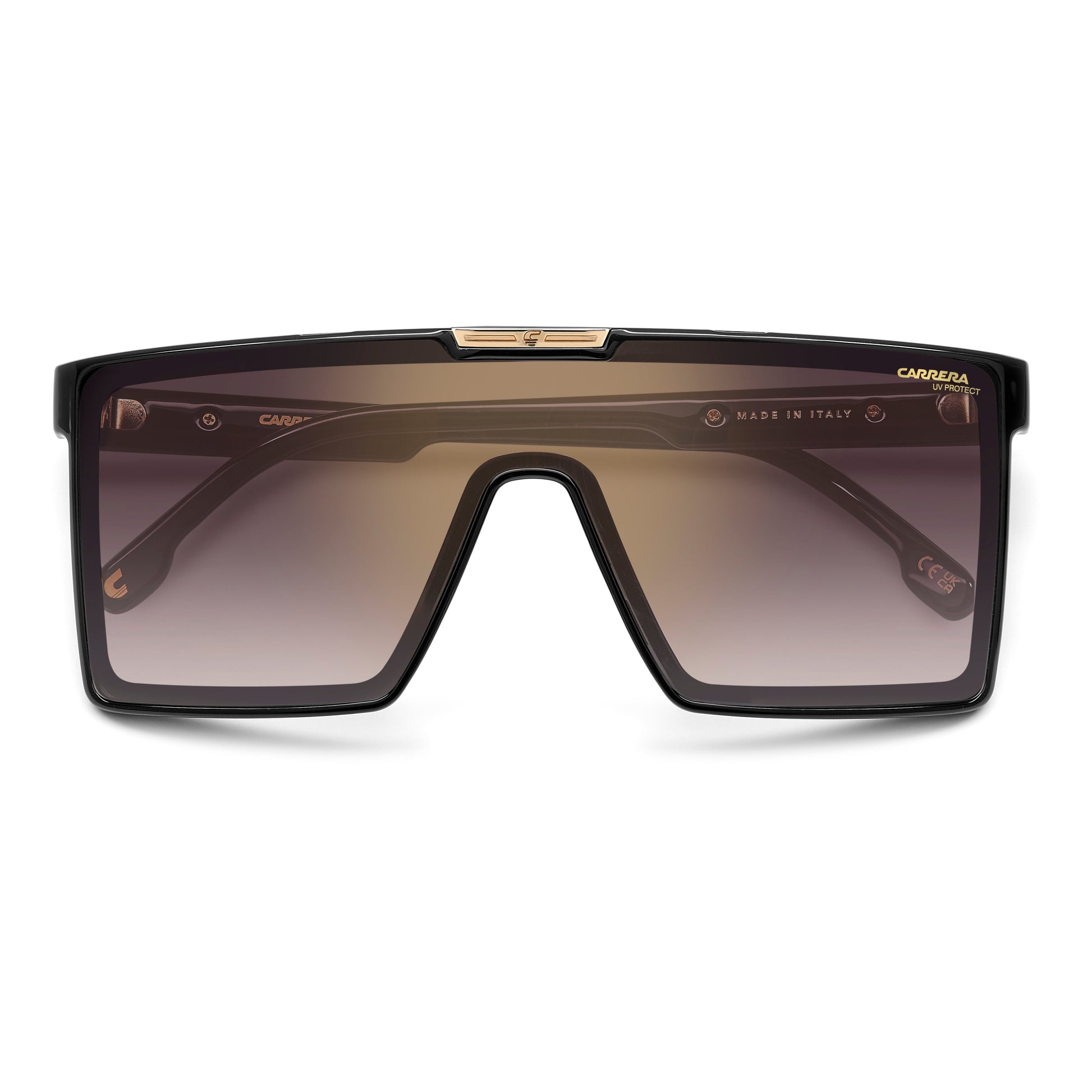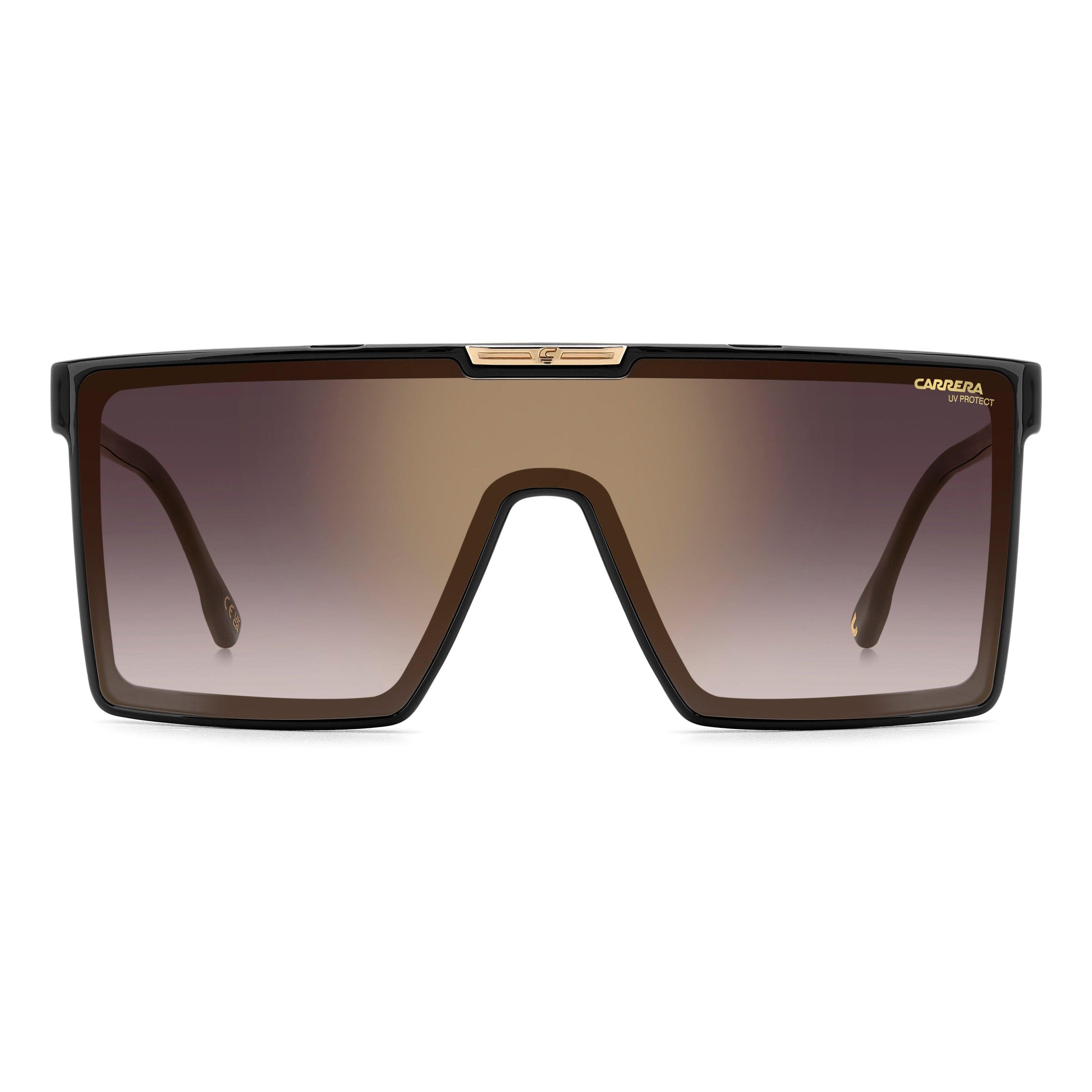 Carrera has transformed sunglasses into a true style statement. This pair is made in Italy, as attested to by the inscription on the inner temple, proof of Carrera’s commitment to quality. The shield frames have a futuristic aesthetic, crowned by the undeniably engaging horizontal ‘C’ logo plaque at the top. The metal detail with the Carrera flag is also echoed on the temples, which narrow slightly around the ears, to complete this unparalleled accessory.