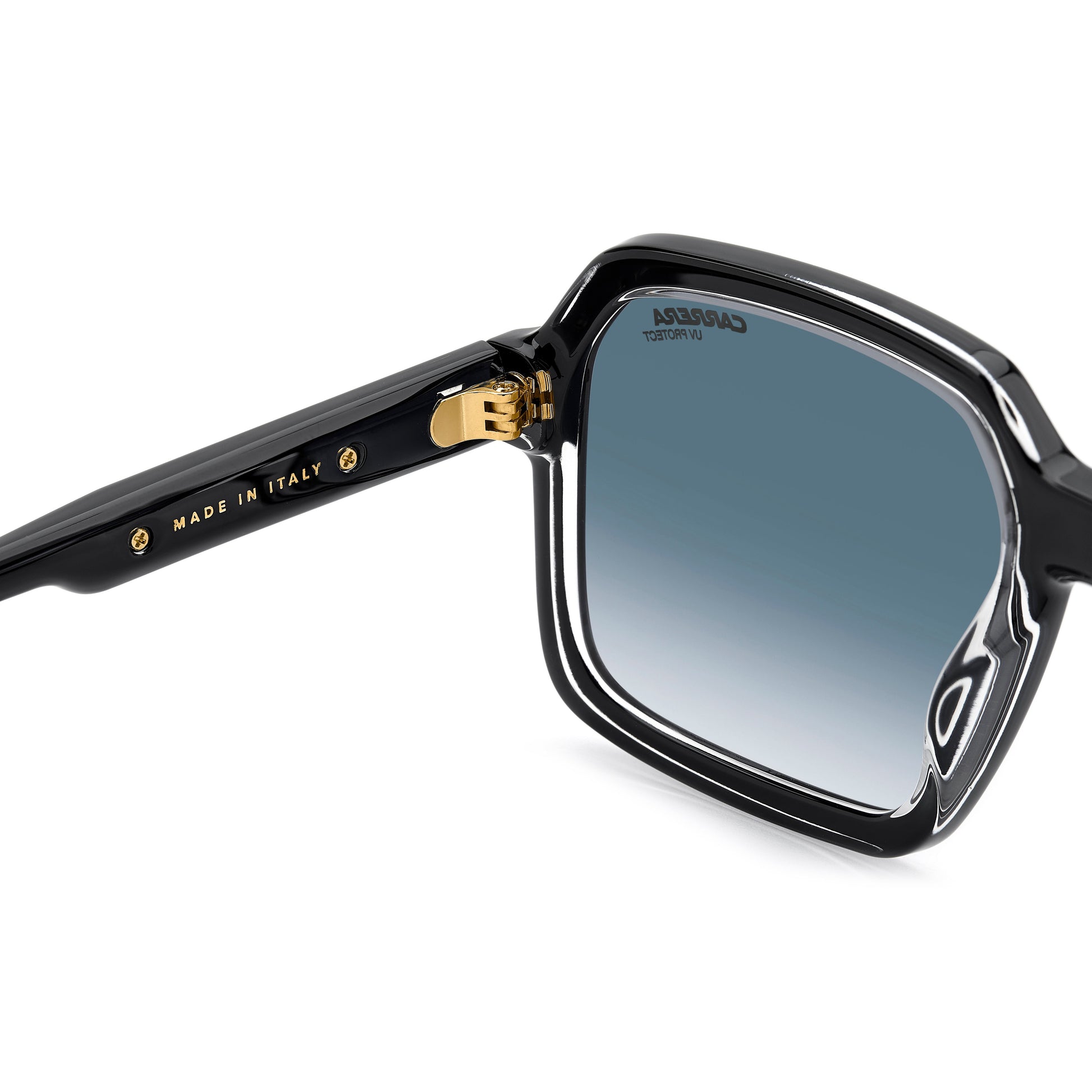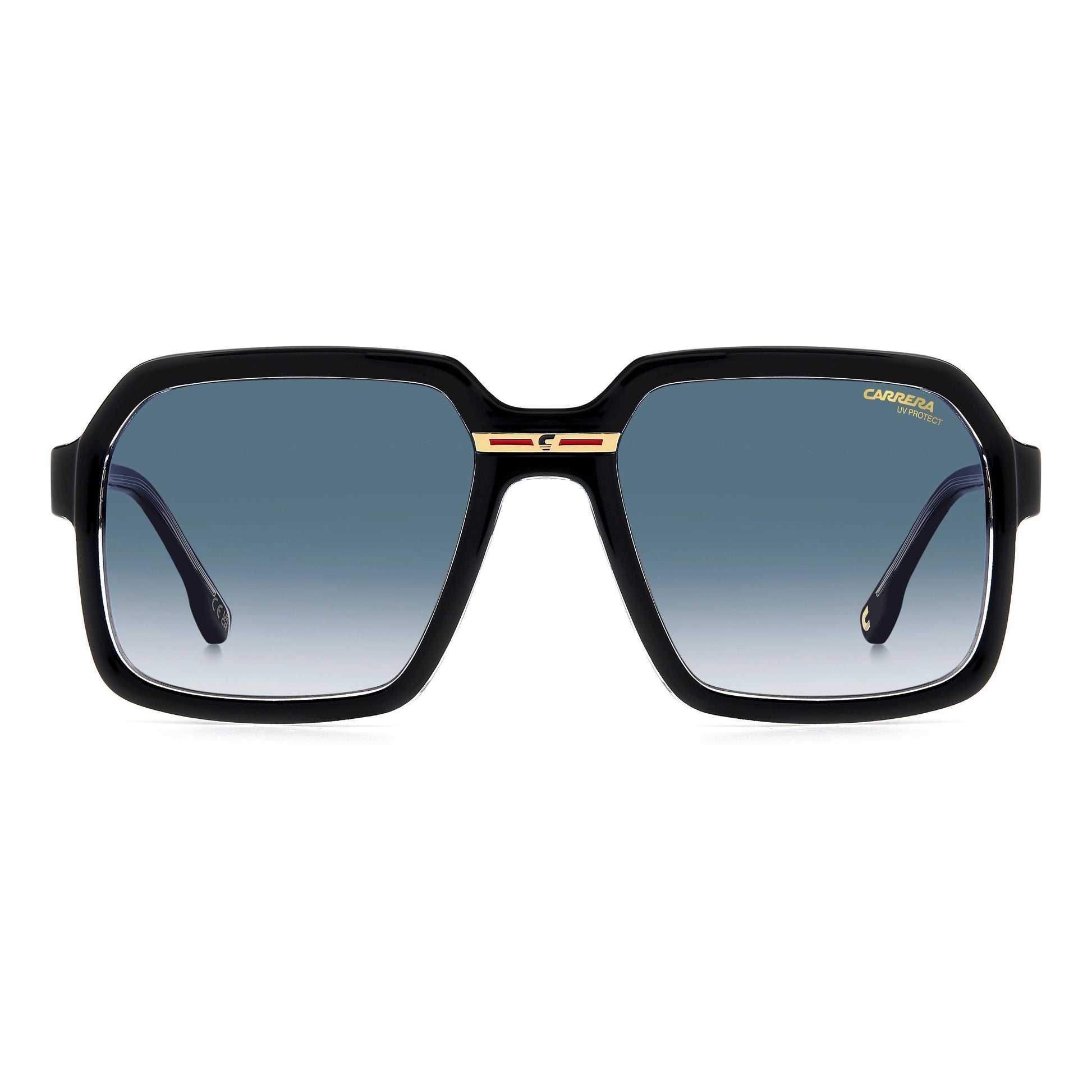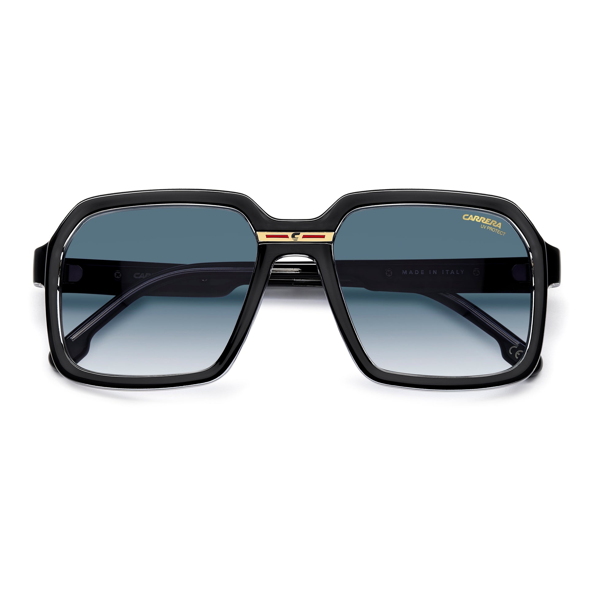 Exploring its archives, Carrera has crafted these sunglasses in Italy, as noted on the inside of the temple. In a contemporary interpretation of a trademark Carrera symbol, the metal plaque with the ‘C’ logo stands out on the bridge. There’s also a metal insert on the temples, with the long-form logo and the Carrera flag. The frames can be fitted with prescription sun lenses. Available in a mirrored lens version.