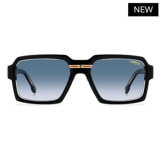 Sleek style and iconic details define these made-in-Italy Carrera sunglasses. The geometric front is the brand's take on current trends and the bold temples make a statement with oversize appeal. Multiple colours are available, including clear frames. Choose mirrored or photochromic lenses. Every pair features Carrera's classic metal insert.