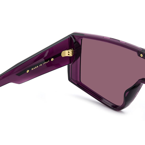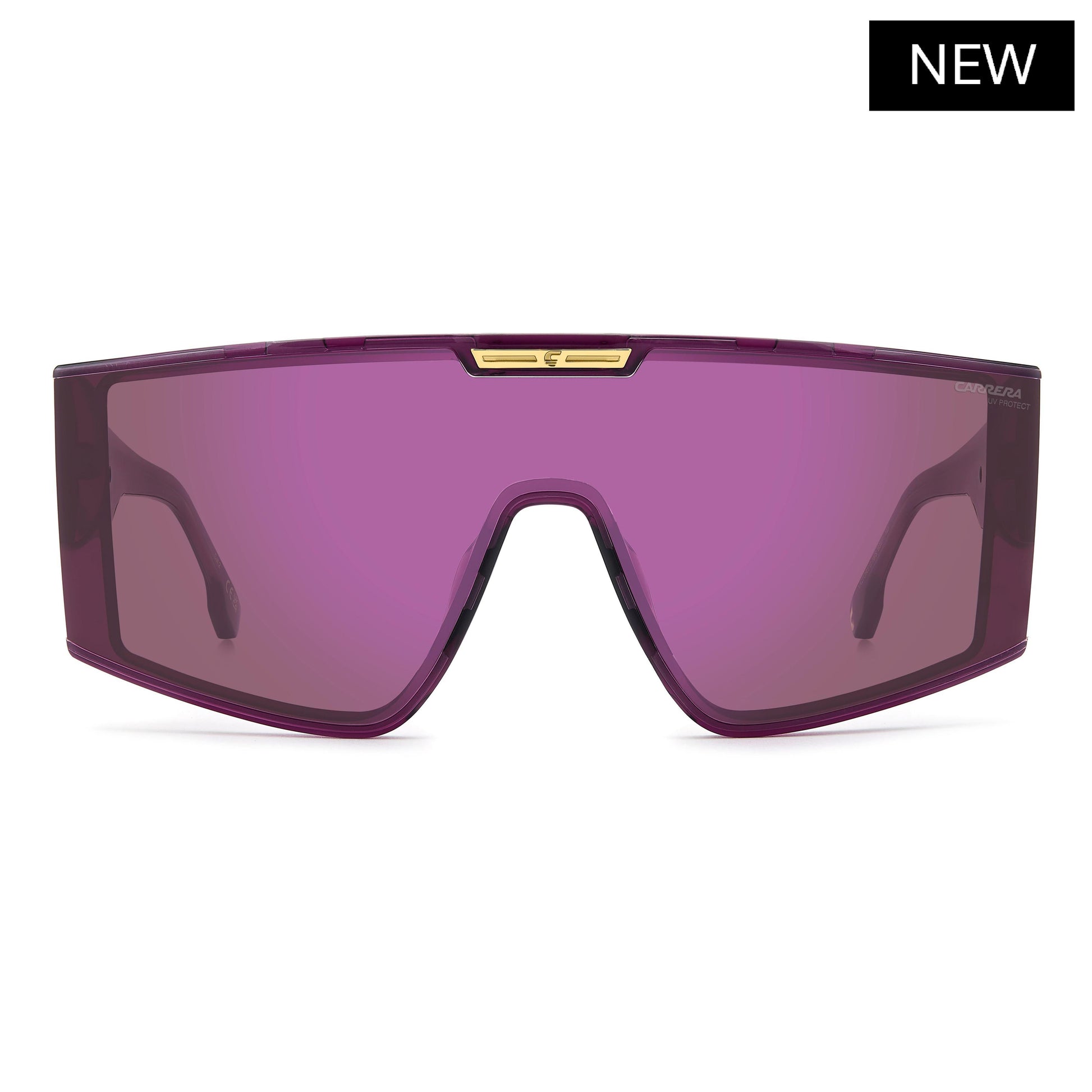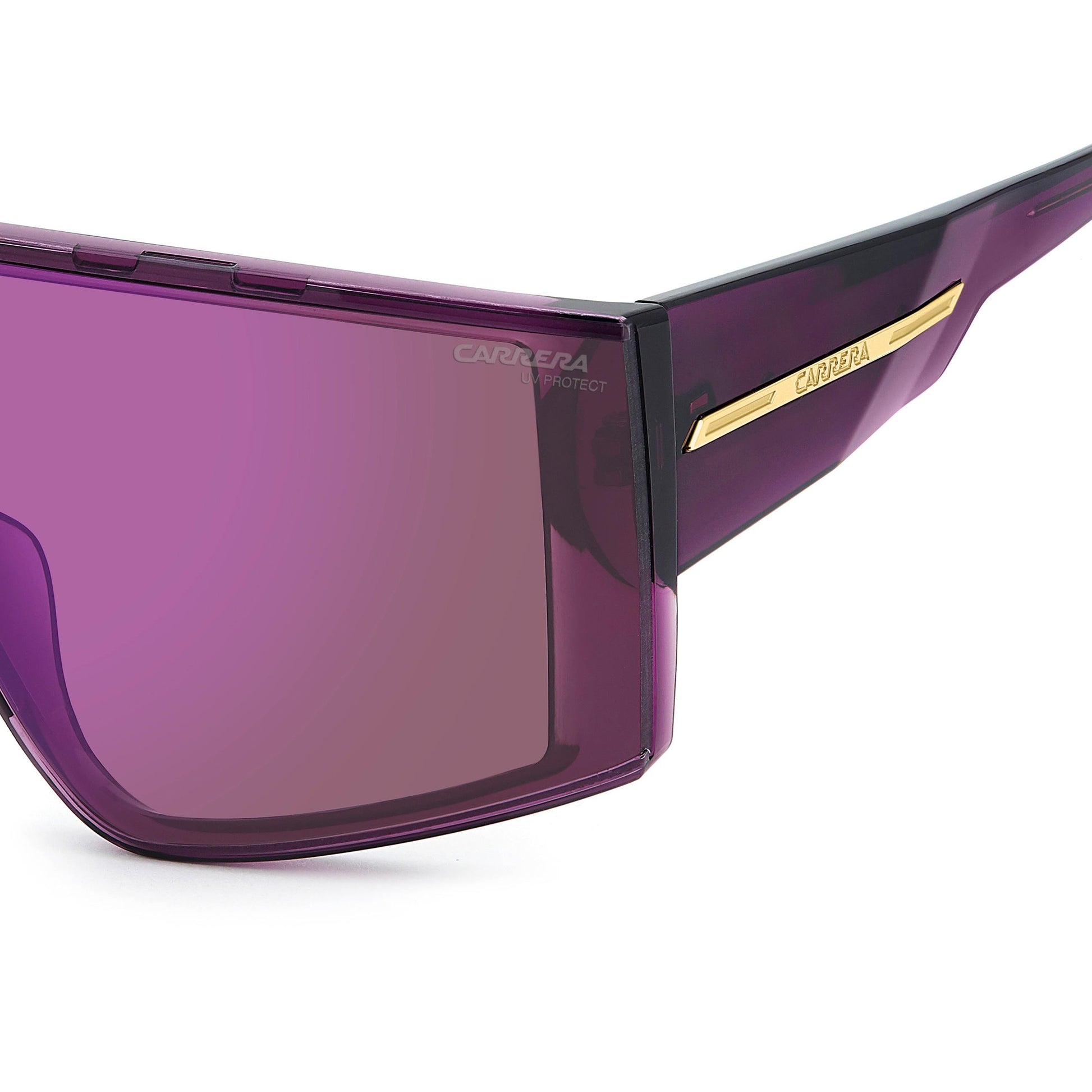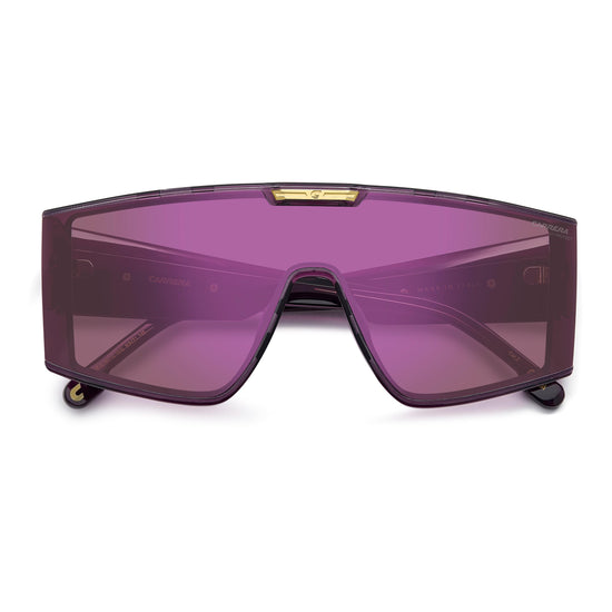 These Carrera shield sunglasses are made to stand out. The single-lens front is striking, especially in the mirrored version. A metal plaque with the brand’s C logo sits at the centre top, repeated on the oversized temples that match Carrera’s bold personality. Made in Italy, they come in different colours, including a transparent option.